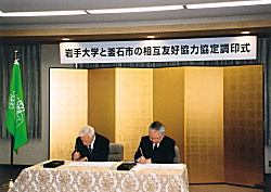 岩手大学と釜石市は、行政・まちづくりに大学の知識を生かすことを目的とする相互友好協定に調印しました。生涯学習や環境、福祉などの分野で市の要請に応じて大学が公開講座に講師を派遣したり、技術協力することを基本とし、現在は地元企業との共同研究や大学の研究成果の技術移転などへ発展しています。