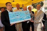 集められた義援金7,000ユーロの小切手を、ラベンダーまつりに招待された在マルセイユ総領事館長澤秀一首席領事が受け取りました。