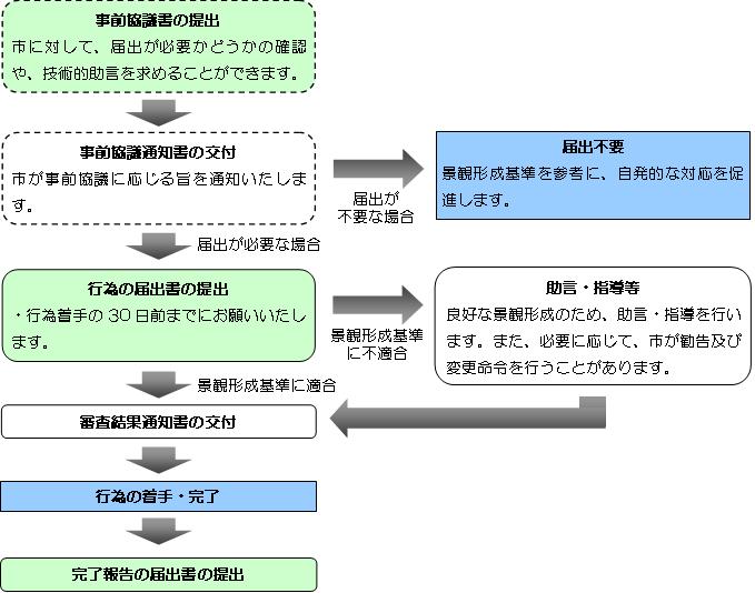 市では、一定規模以上の建築物や工作物の建築、開発行為など、景観に大きな影響があると考えられる行為について、行為に着手する30日前までの届出と、行為完了の報告を義務づけています。届出の手続きや技術的助言については、建築等を計画する段階から、事前協議を行うことが可能です。