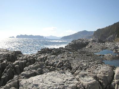 南側には花崗岩の巨大な奇岩が敷きつめられたような「千畳敷」があり、ここから三貫島を望むことができます。
