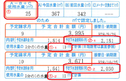 2か月分の水量(1)を半分に分けて請求します。(1)が奇数の場合には初めの月の方で1m3多く計算します。(1)-1(7月に使用、9月に支払い)は13m3、(1)-2(8月に使用、10月に支払い)は12m3で計算されます。