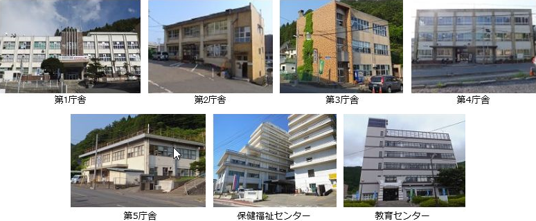 現在の市役所庁舎は、第1庁舎から第5庁舎まで、そして鈴子町の教育センターと大町の保健福祉センターがあります。