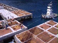 ケーソンは、巨大な鉄筋コンクリートの箱です。津波など大きな力でも倒れないように、一番大きいもので重量は16,000トン、高さ30メートルほどで、1つ造るのに約16カ月間かかります。 釜石湾口防波堤には大小合わせて77函のケーソンが据え付けられました。