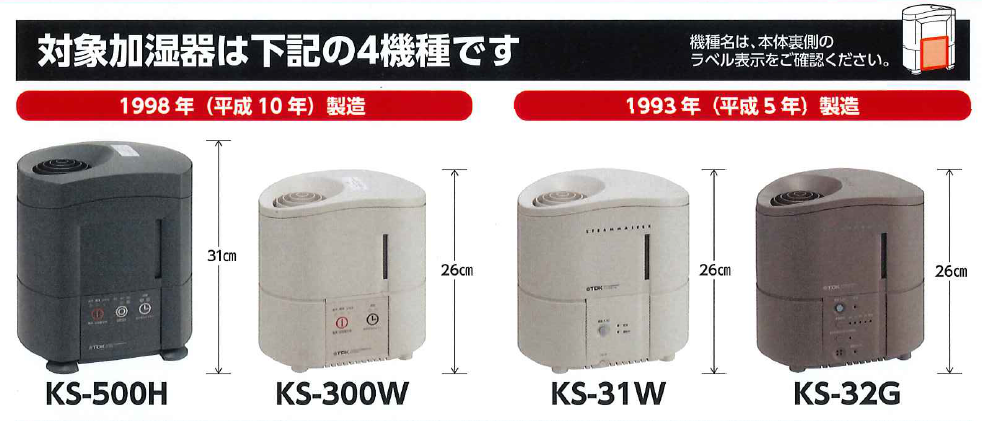 お持ちの加湿器のメーカー名・型番をいま一度ご確認のうえ、製品回収へのご協力をお願いします。
