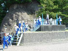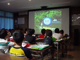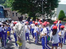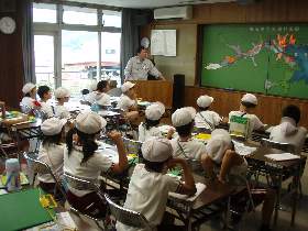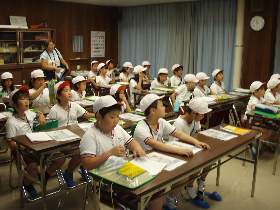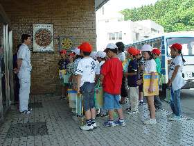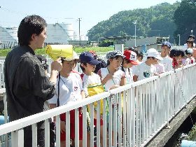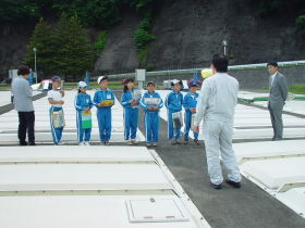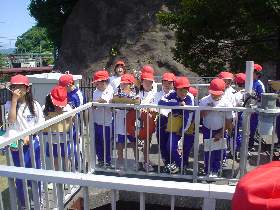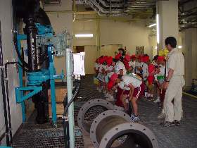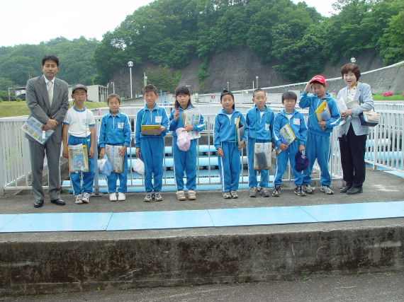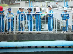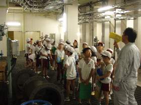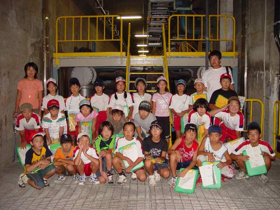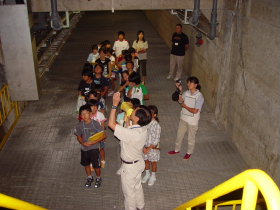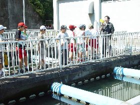 | 10 | H20.07.09 甲子小学校の皆さんが見学に来てくれました 釜石市立甲子小学校4年1組と2組、先生と合わせて54名のみなさんです。 1回の見学で30人を超える場合には会議室に入りきれませんので2つに分けて説明をします。 1組ははじめに管理棟2階の会議室に入ってビデオなどの説明を聞きました。  質問も出ました  中央管理室で、監視装置を見学 水質試験室では水をきれいにする微生物を観察  地下に下りてポンプや配管、長い地下の廊下「管廊」を通って、地上に出て着水井・最初沈澱池をまわります  微生物で茶色になった反応タンク(曝気槽・エアレーションタンク) 最後にラベンダーの花摘みをしました  きれいになった水が流れ出る最終沈澱池の前で記念撮影をしました  4年2組は最初に地下室に入りました。 長い100mもある管廊を進んで行って途中から地上に出ました  地上では流入したばかりの下水の色と臭いを確認 水深が5mあるばっき槽をのぞきました  最終沈澱池できれいになった水を見て、 室内の水質試験室では顕微鏡で微生物を直接見ました  会議室では下水道のキャラクター スイスイが出てくるビデオを見て、  熱心に説明を聞いてもらいました。 最後にラベンダーの花摘みもできました  甲子小学校の皆さん、来年もぜひ見学に来てください