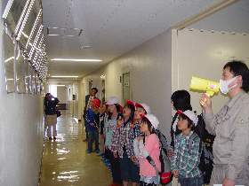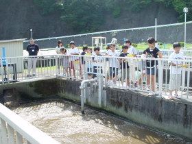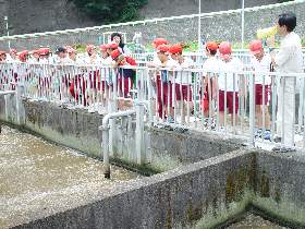 | 14 | H20.09.19 釜石小学校4年生の皆さんが見学に来てくれました 9月19日の午前に、釜石市立釜石小学校4年1組と2組、合わせて44人の児童と引率3人の計47人の皆さんが大平下水処理場を見学しました。 写真でそのようすを紹介します。 最初に1組は2階の会議室でビデオと説明を受けました。いろんな質問が出ました。  中央管理室では設備や水の状態を監視する装置を、水質試験室では水をきれいにする微生物を観察しました。ここでもたくさん質問が出ました。  次に地下に潜って管廊を通り、地上に出て着水井を見学  最初沈澱池、曝気槽、最終沈殿池 と下水が変化するようすをみました。  最後にきれいになった水(最終沈殿池の前でみんなで記念写真を撮りました