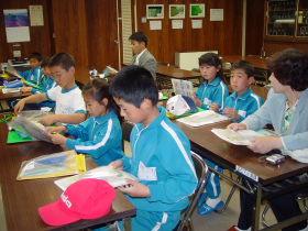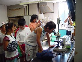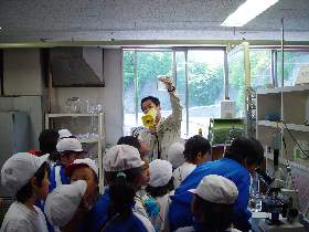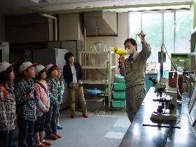 |  | 最初に管理棟2階の会議室で、ビデオと説明板で下水道のしくみや釜石市内の普及状況の説明を受け、そのあと質問をしたりして学習しました。 |  |  | 次に水質試験室で、汚れた水がきれいになる過程を間近にみたり、活性汚泥と呼ばれるドロの中にいる微生物を顕微鏡で観察しました。