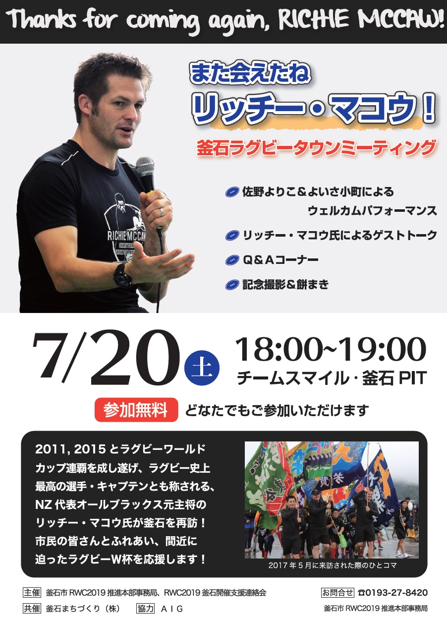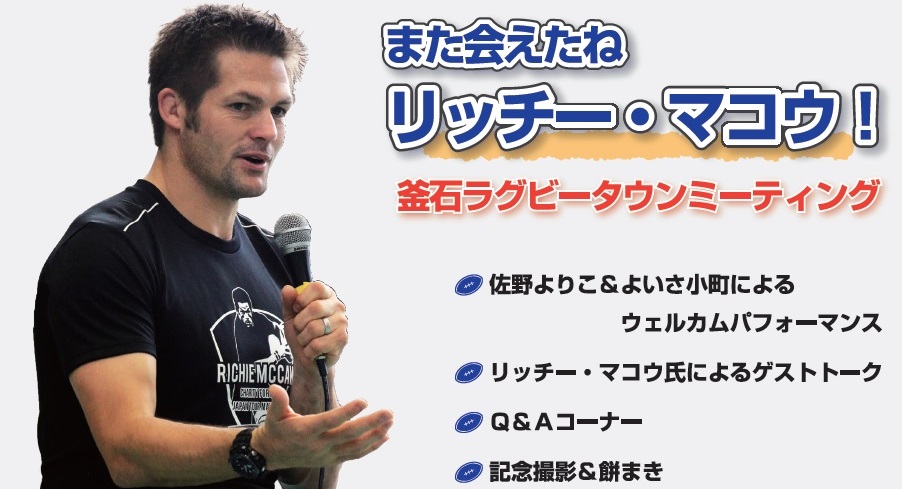 RWC2019日本大会釜石開催の市民の盛り上がりを進めるため、2011、2015とRWC連覇を成し遂げ、ラグビー史上最高の選手・キャプテンとも称される、ニュージーランド代表オールブラックスの元主将「リッチ—・マコウ」さんが釜石に再訪されることから、タウンミーティングを次のとおり開催いたします。皆様お誘いあわせのうえご来場願います。