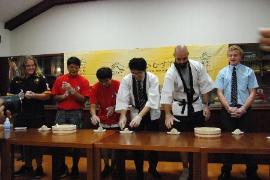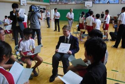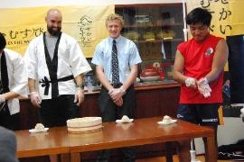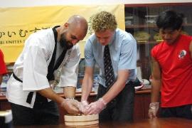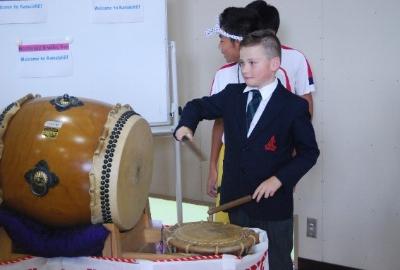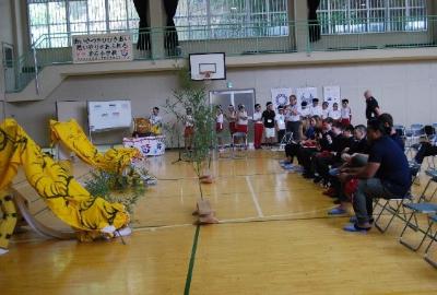 体育館で、日本・釜石の文化(食、踊り、書道、世界遺産等)の紹介、実演