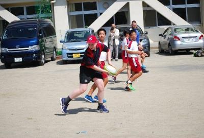 校庭で、遊び、ラグビーを通じた交流