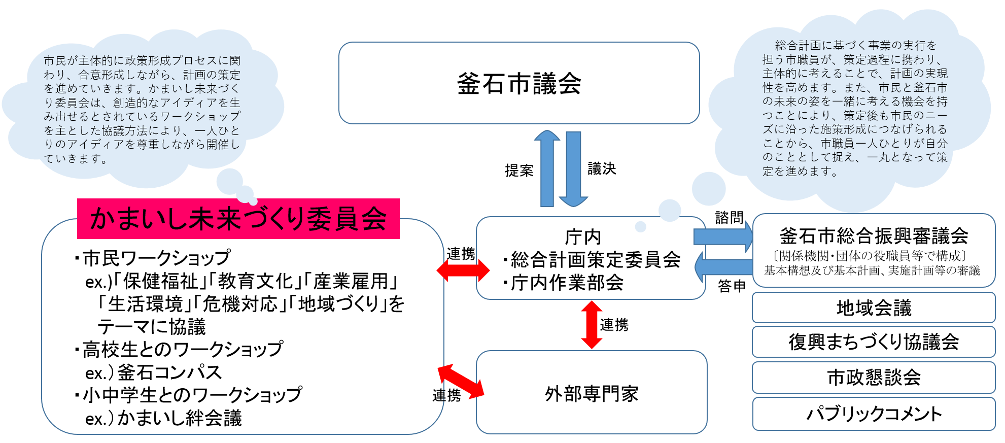 この委員会は、市民と行政の協働のもと、ともに知恵と力を出し合い、市民の自覚と行動に基づく市民主体の計画づくりを進めながら、釜石市の総合計画の策定にあたり素案を調整し市長に提言するとともに、計画の実行にあたっては、市民協働のまちづくりに向けた様々な取り組みの中心になって活動していただく人材を育成することを目的としています。