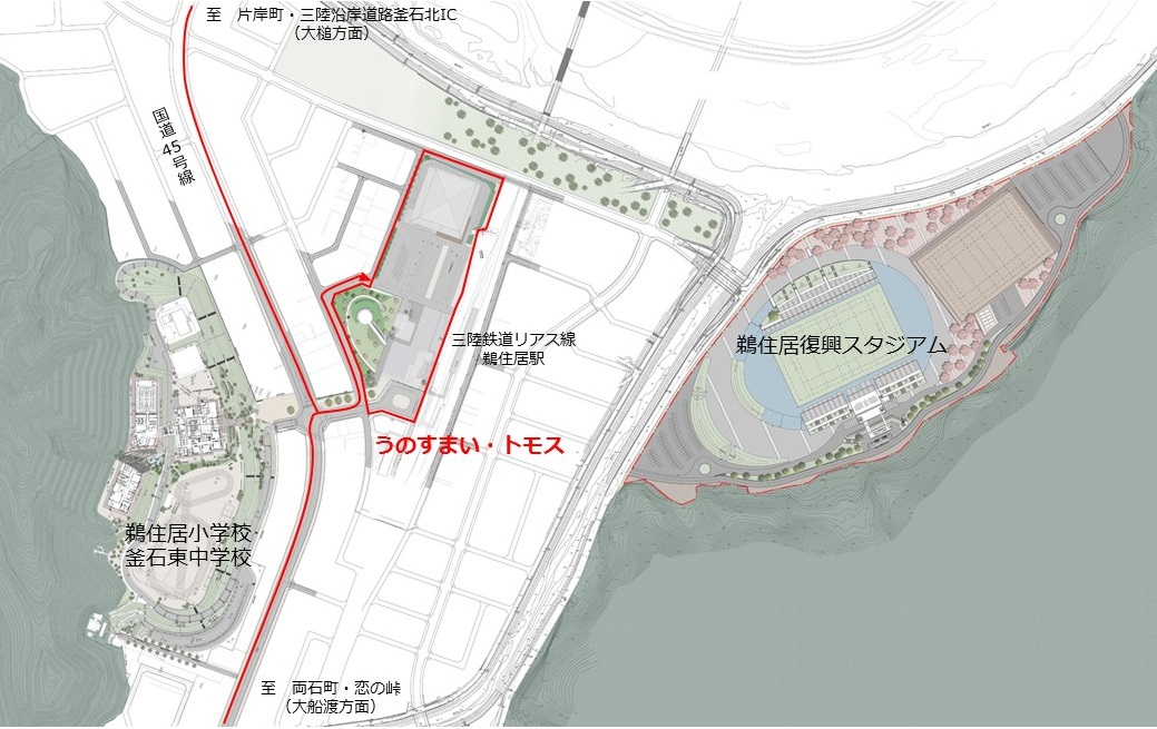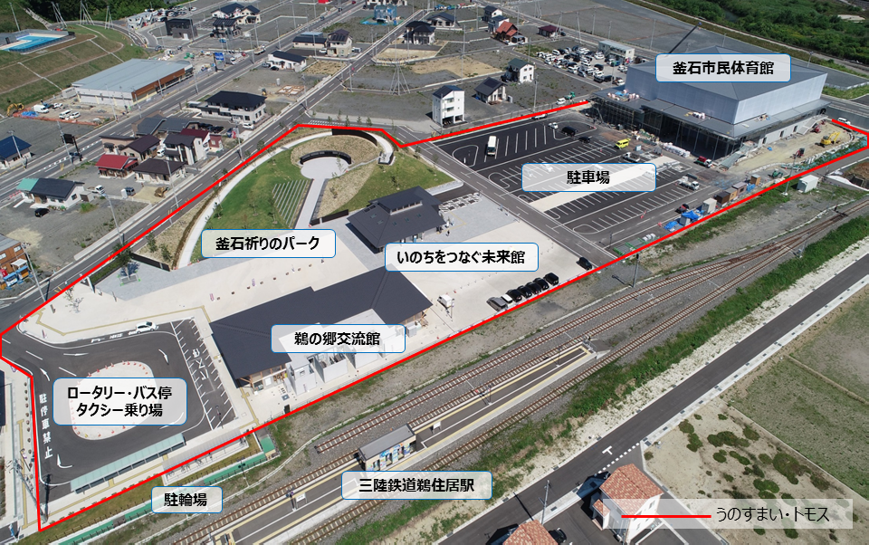 うのすまい・トモスは、「東日本大震災の記憶や教訓を将来に伝えるとともに、生きることの大切さや素晴らしさを感じられ、憩い親しめる場」として、複数の公共施設を一体的に配置し、地域活動や観光交流を促進する鵜住居駅前エリアです。東日本大震災慰霊施設「釜石祈りのパーク」、防災学習施設「いのちをつなぐ未来館」、観光交流拠点施設「鵜の郷交流館」などで構成しています。