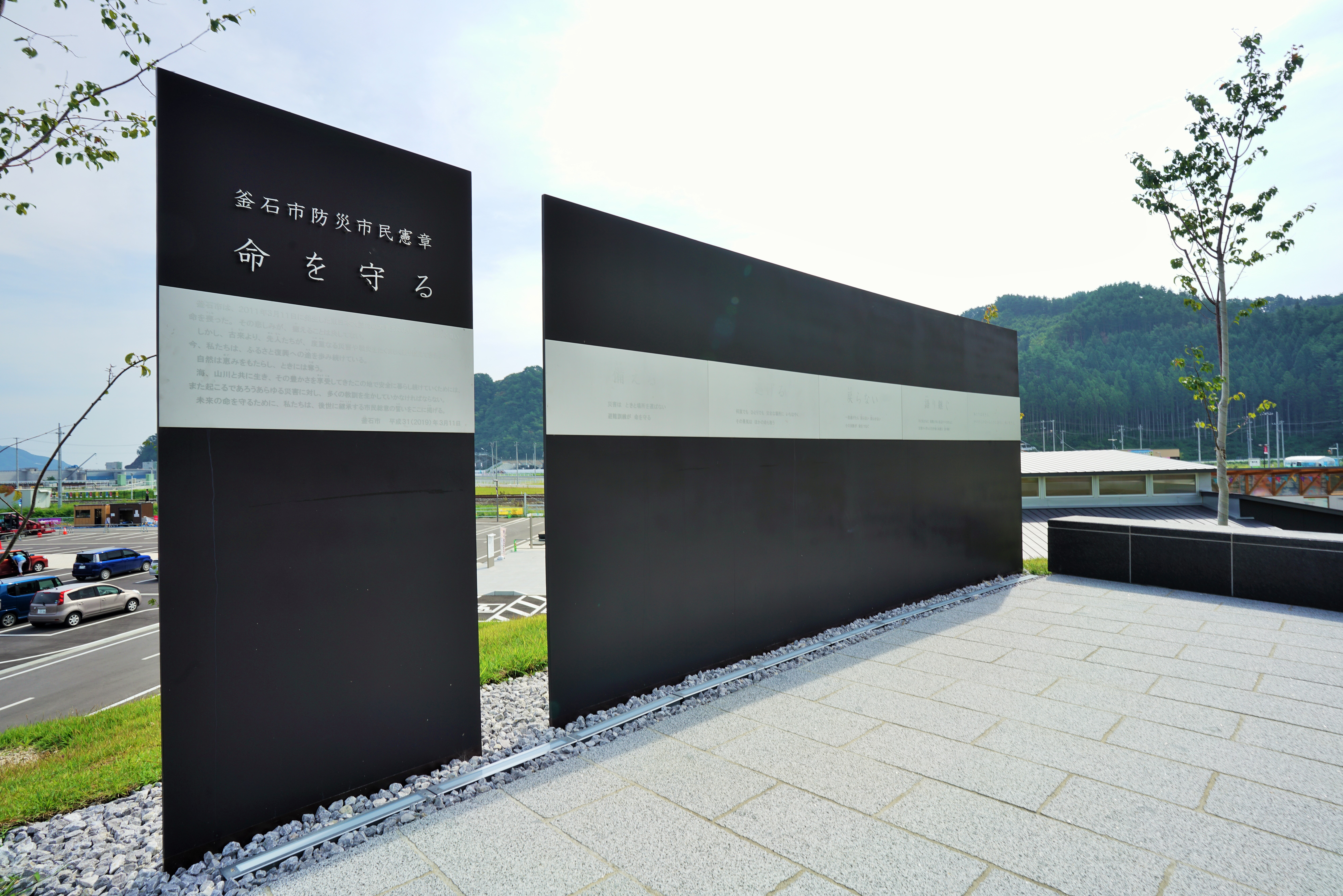 中央の慰霊碑には犠牲者の芳名を刻んだ芳名板や献花台を設置し、丘の上にはあらゆる災害から未来の命を守る市民総意の誓いとして作られ、平成31年3月11日に制定した「釜石市防災市民憲章」を刻んだ碑などを設置しています。
