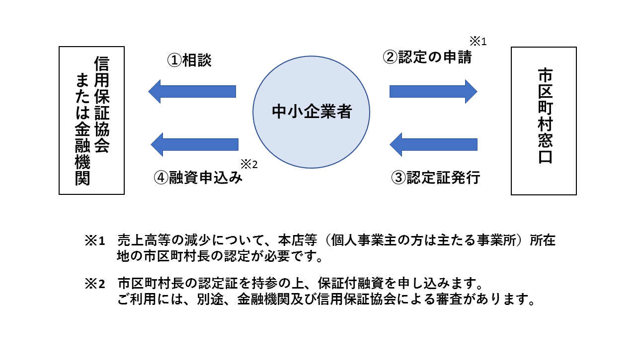 ご利用には、登記簿上の本店所在地(個人の場合は主たる事業所の所在地)のある市区町村長から、中小企業信用保険法第2条第5項の規定に基づく「特定中小企業者」の認定を受ける必要があります。