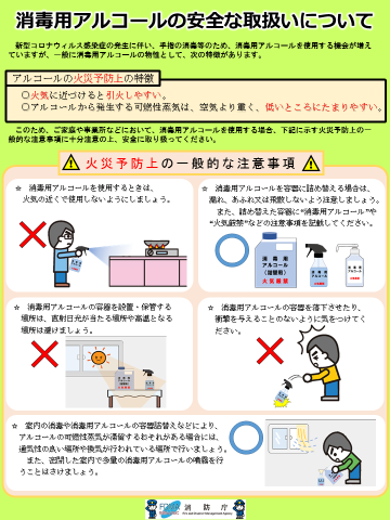 消毒用アルコールは火気により引火しやすく、また、発生する蒸気は可燃性で空気より重く低所に滞留しやすいため、取り扱う場合には次の項目に注意してください。