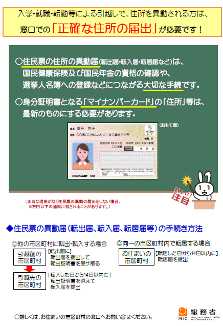 お住まいの市区町村で、行政サービスを確実に受けられるようにするため、入学・就職・転勤等に伴う引っ越し等により住所を移した方は、速やかに住所変更の届出を行ってください。
