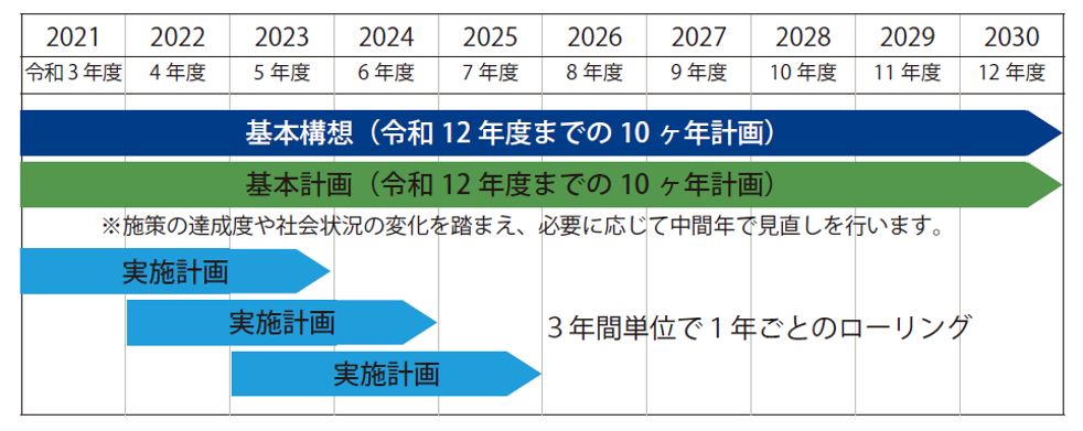基本構想、基本計画及び実施計画について、それぞれ以下の計画期間で策定するものです。