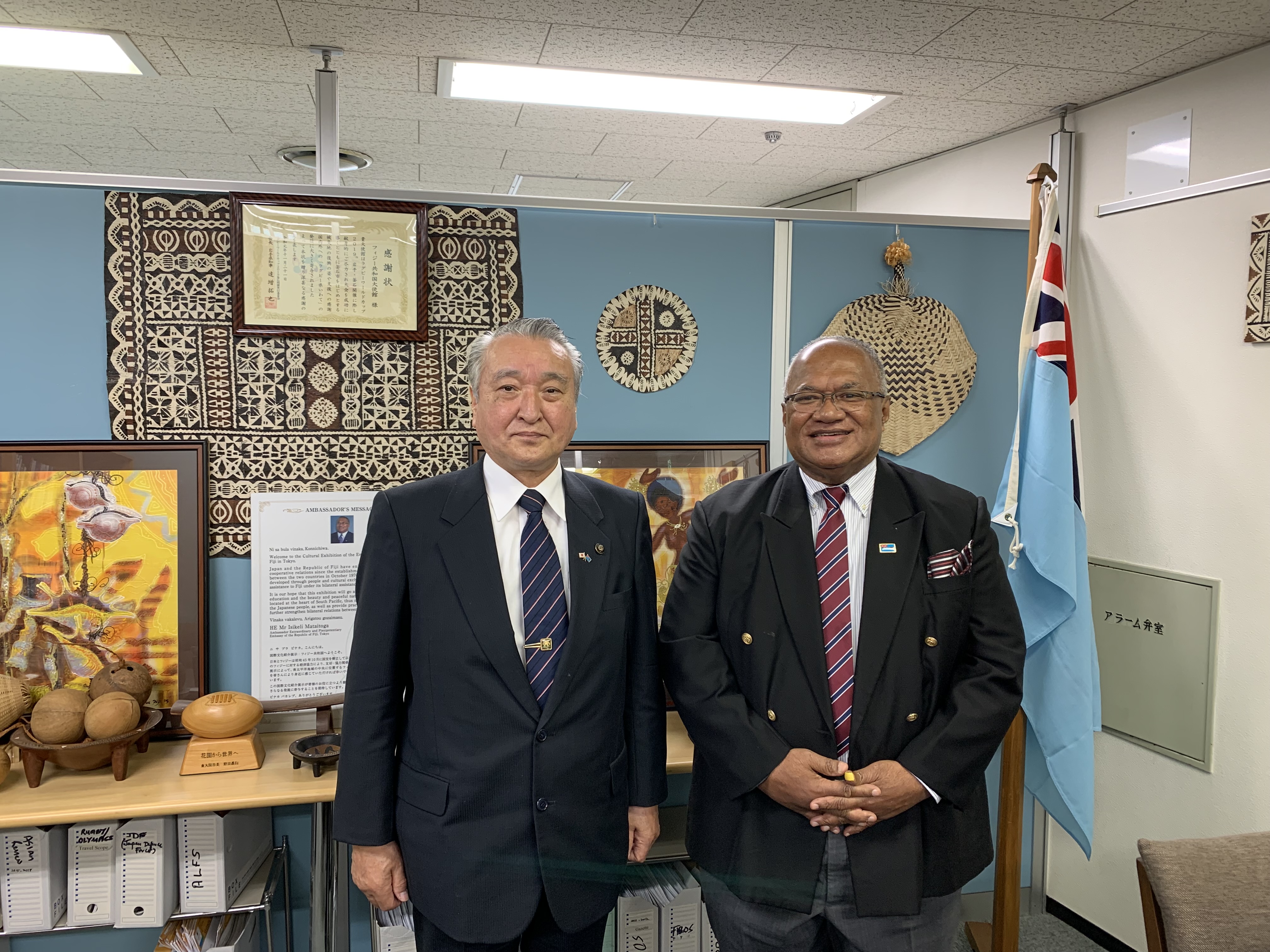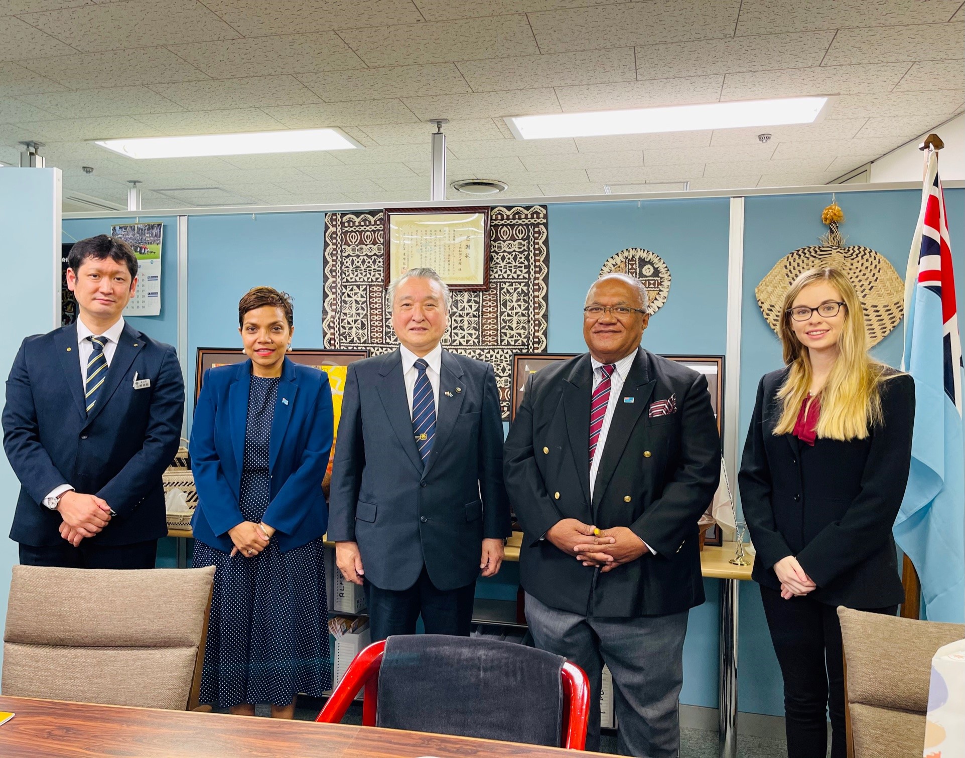 市はフィジー共和国とRWC2019岩手・釜石開催をきっかけとし、2020年12月に発生し同国に壊滅的な被害をもたらしたサイクロン「ヤサ」の被害者支援の募金を行う等、以後継続的に親交を深めてきています。この度、RWC2019岩手・釜石開催の際に釜石鵜住居復興スタジアムを訪れ、市と深く親交を結んできたイシケリ・ウルイナイライ・マタイトガ駐日特命全権大使が帰国することとなり、その挨拶も兼ねて市長が大使館を訪問いたしました。