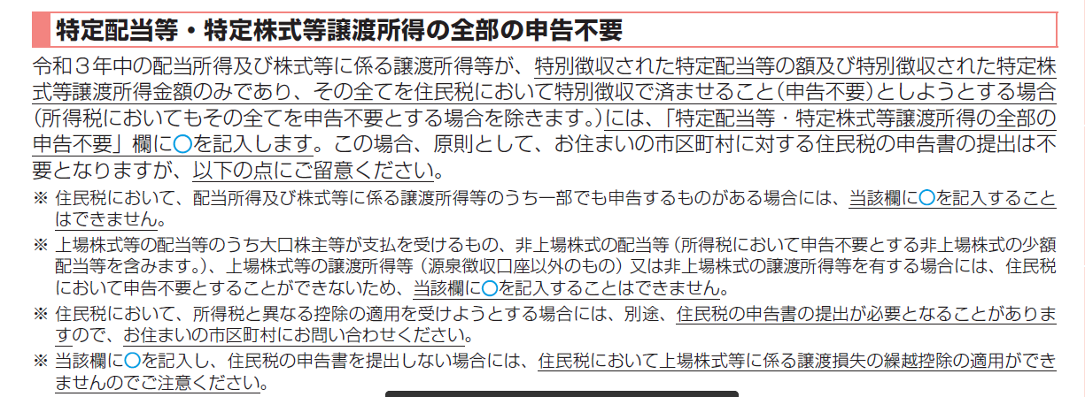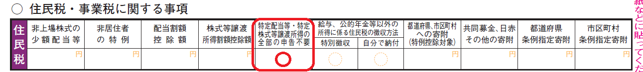 個人市民税・県民税申告において、特定配当等及び特定株式等譲渡所得金額に係る所得の全部を申告不要とする場合に、原則として確定申告書の提出のみで申告手続きが完結できるよう、令和3年分確定申告書より、個人住民税に係る附記事項が追加されることになりました。