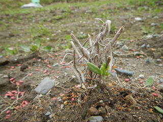 令和3年9月に定植した苗の一部は、残念ながら何かの被害により、茎が剪定でもされたかのように切れてしまっていました。枯れたようになっていた苗を、定植した区画から掘り起こしたり、拾い集めたりして水揚げをし、改めて土に植えると、鮮やかな緑色の芽が出てきました。枯れたように見えても、苗はしっかりと生きていたようです。