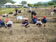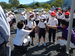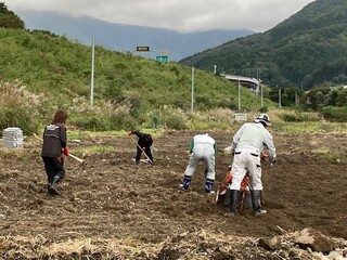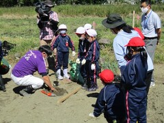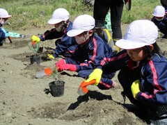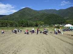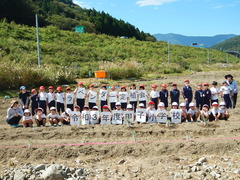遊休地だった農地を復活させ、令和3年9月22日、地元の小学校である釜石市立甲子小学校1学年39名の児童と市職員が協力して、初めて苗の定植を行いました。