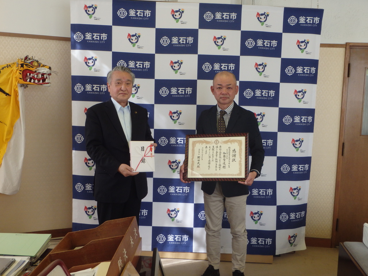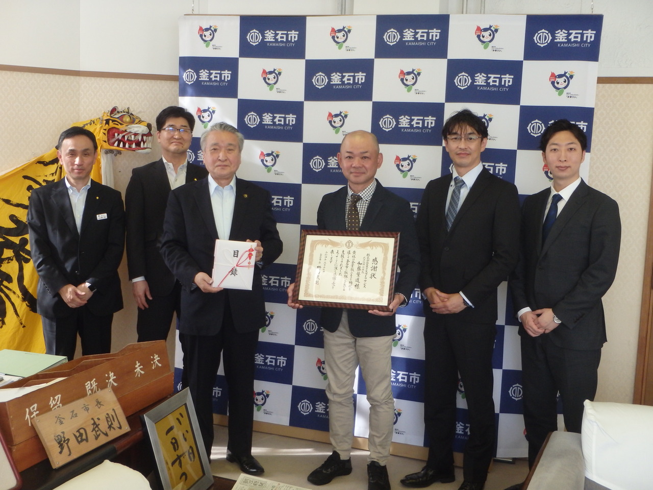 同社は釜石シーウェイブスRFCのオフィシャルスポンサーであり、その縁で当市の「ラグビーを通じたまちづくり」に対してご支援をいただいたものです。