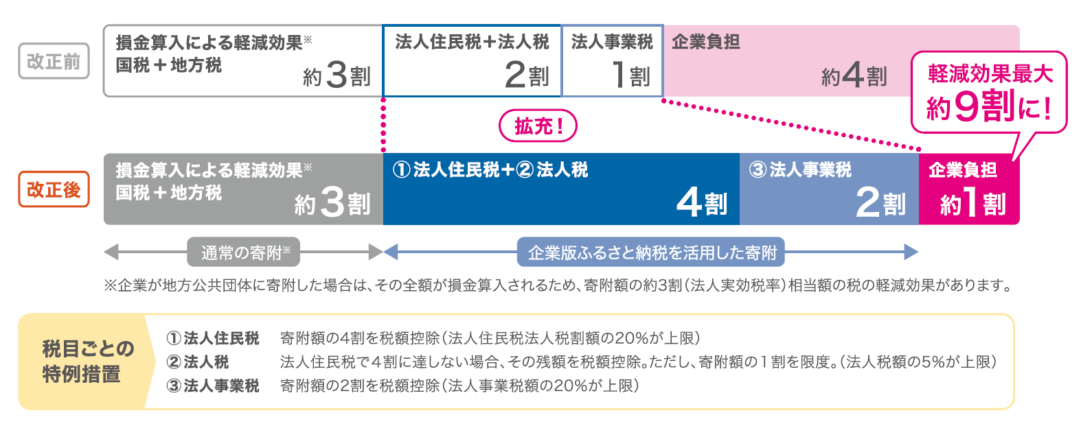 令和2年度税制改正により、従来の地方公共団体に対する企業・法人の寄附に係る損金算入措置による軽減効果(約3割)と合せて、最大で寄附額の約9割に相当する額が軽減されることとなります。