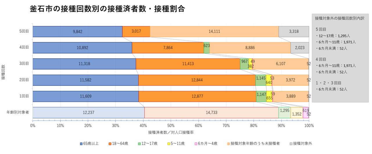 - 4回目の場合、「65歳以上の接種済者」「18~64歳の接種済者」「12~17歳の接種済者」「12歳以上の未接種者」「接種対象外(0~11歳)の人数」