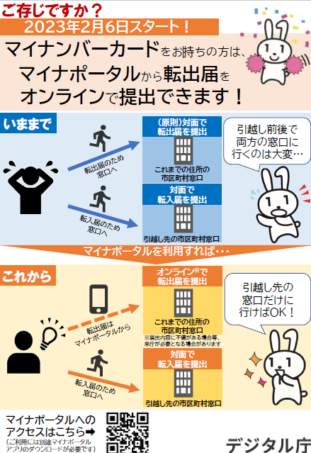 ※マイナポータルを通じて転出届の提出をした後は、別途、転入先の市区町村の窓口で転入届等の手続きが必要です。