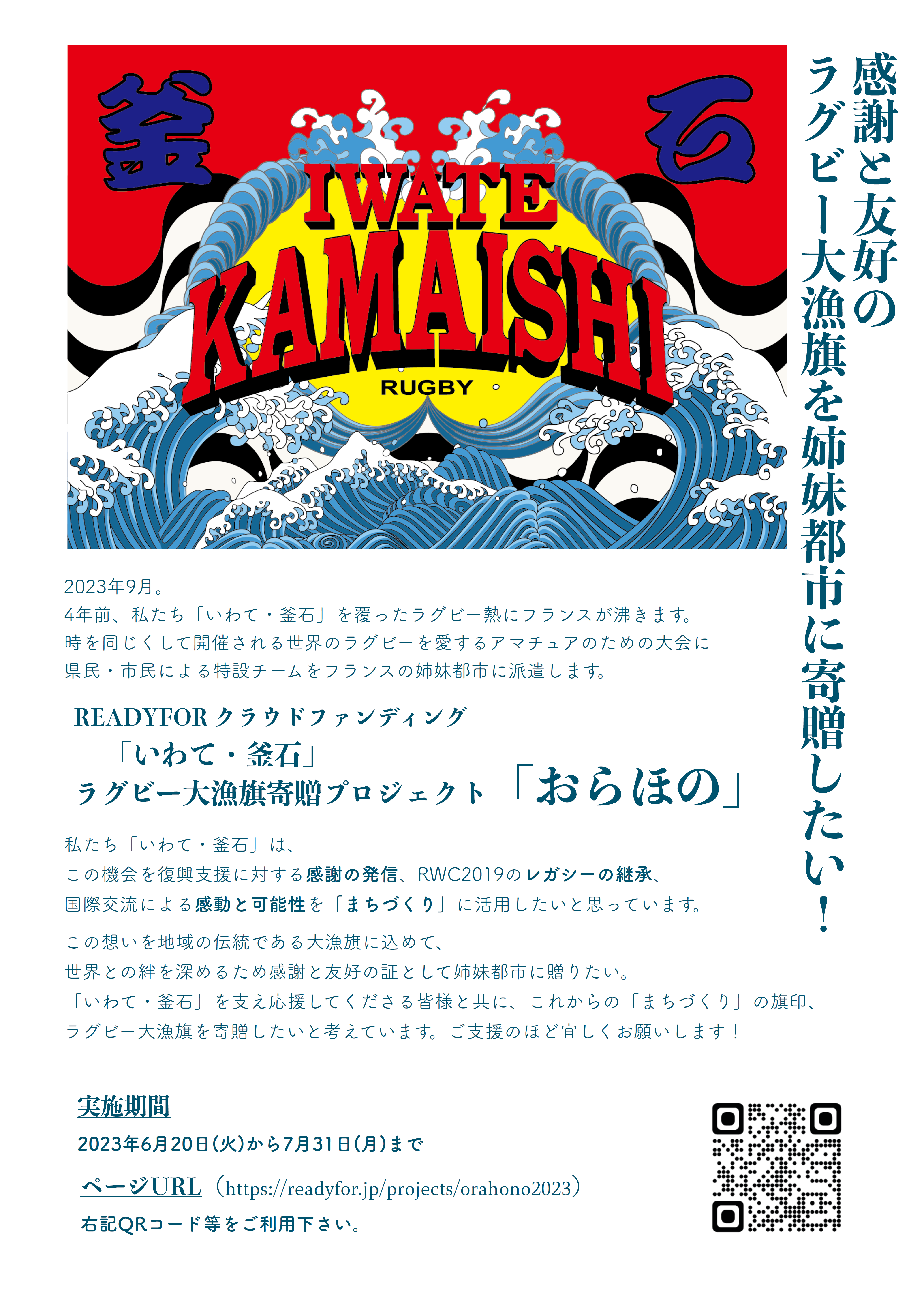 「いわて・釜石」感謝と友好のラグビー大漁旗を姉妹都市に寄贈したい!