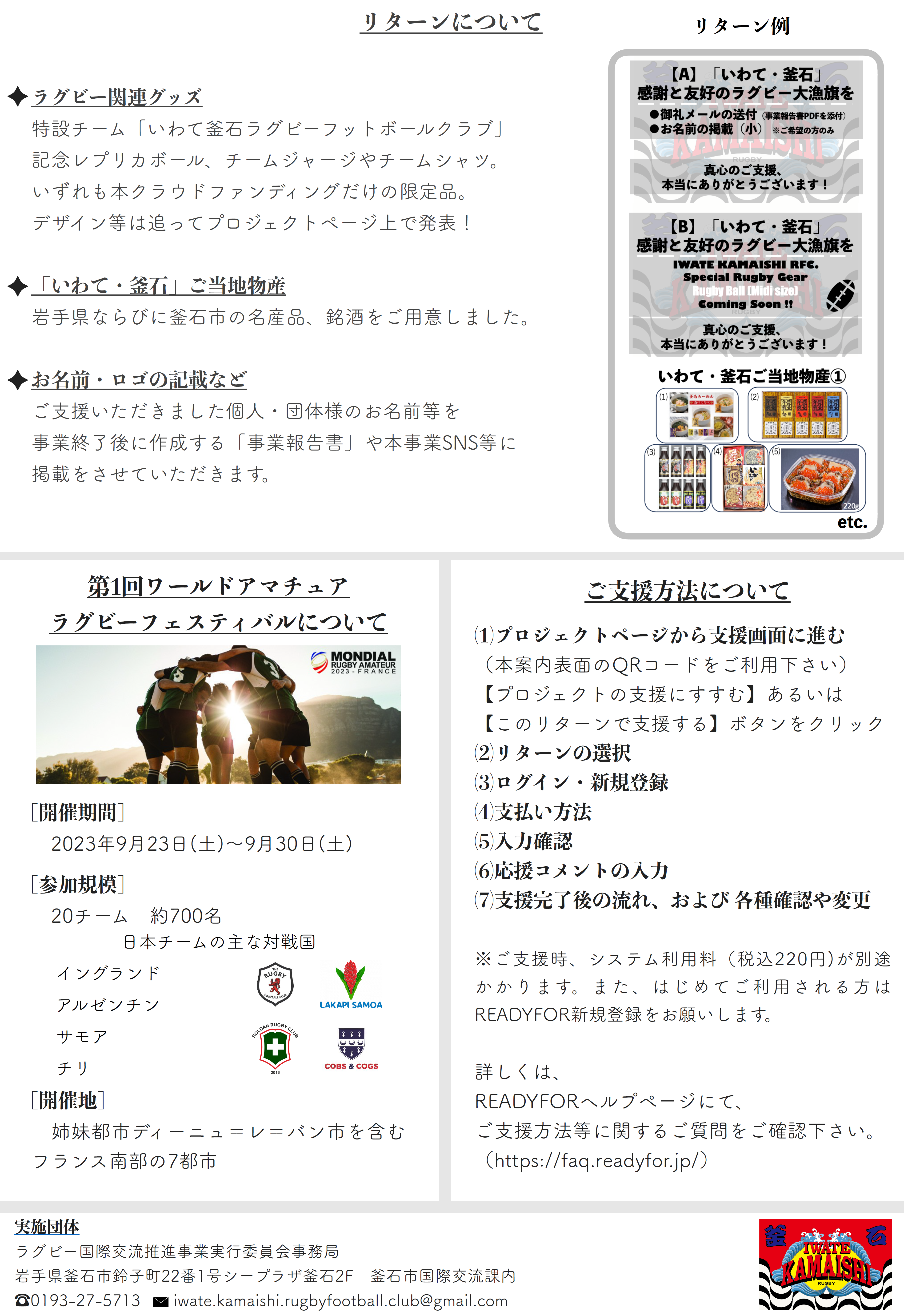 いただいたご支援とお気持ちに応えるべく、9月下旬の派遣に向けて活動に力を入れてまいりますので、今後ともいわて釜石ラグビーフットボールクラブを応援くださいますようお願いいたします。