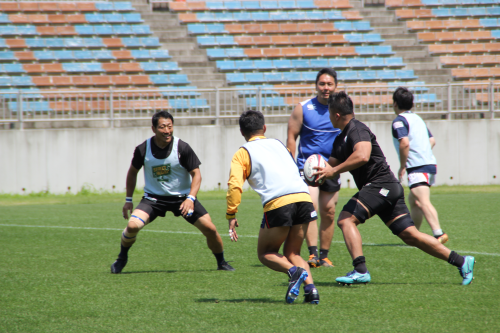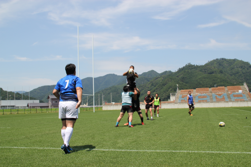 午前には練習会が開催されました。隣同士の選手を紹介する他己紹介や基礎練習、フォワード、バックスに分かれての練習等を行いました。当日は30度を超える猛暑の中、選手たちは基礎練習などに取り組み、世界の強豪チームとの対戦に向けて練習に励みました。