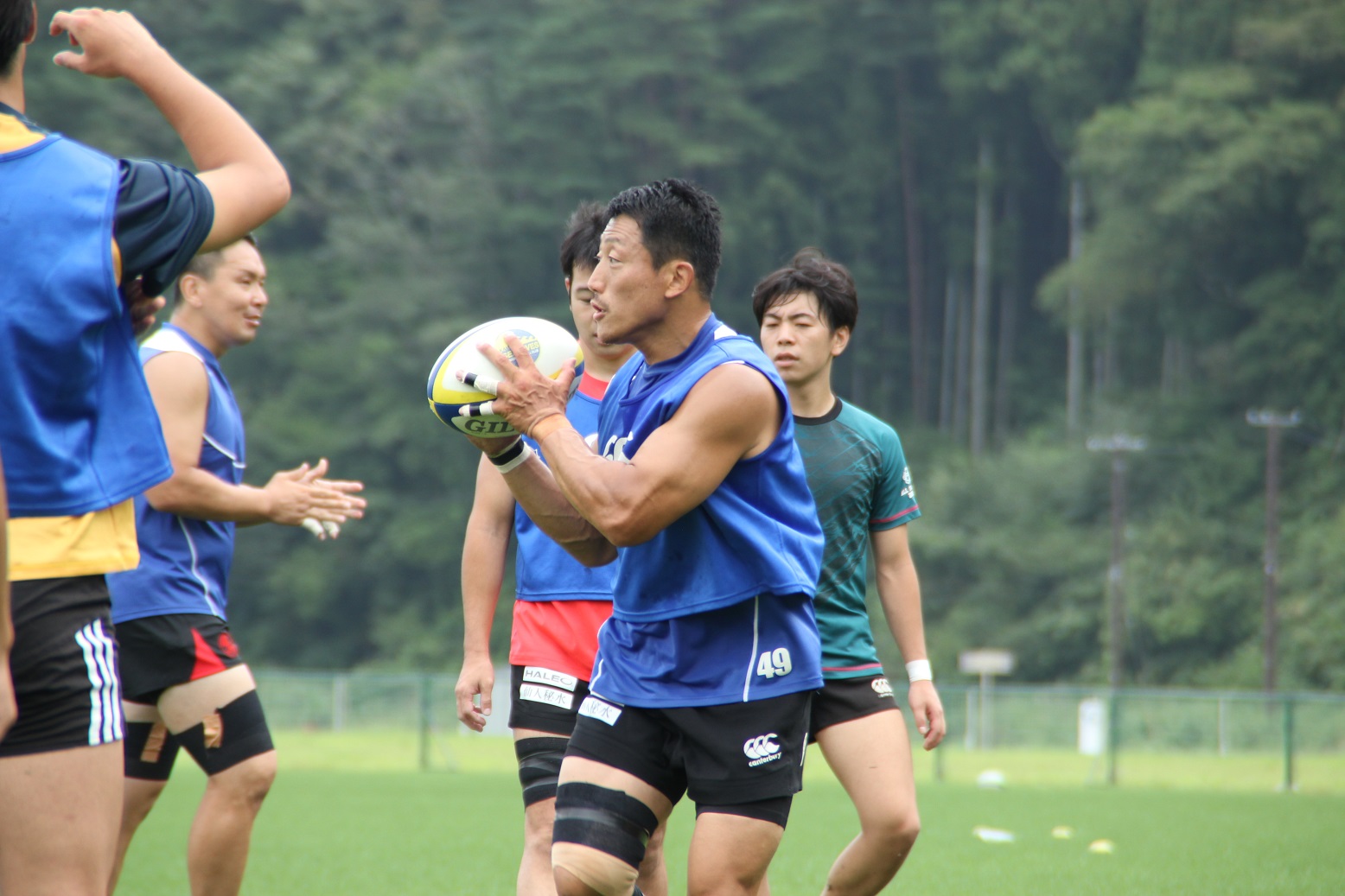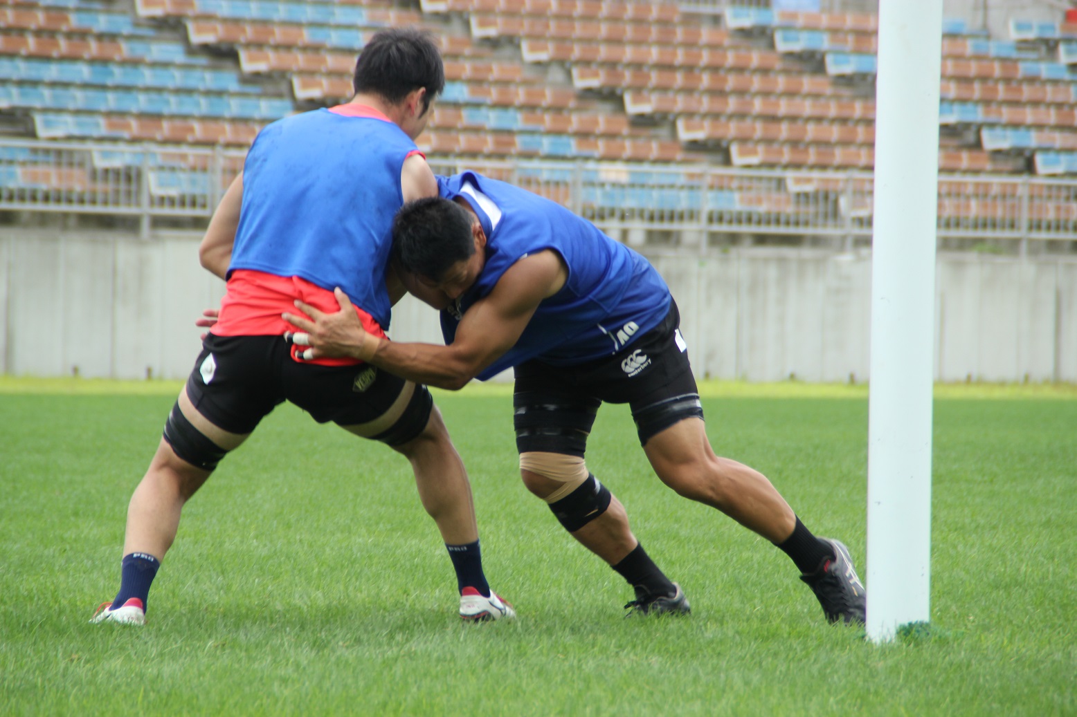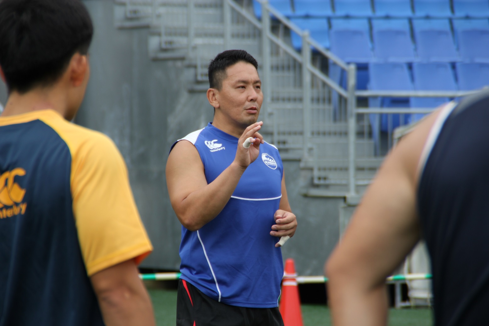 国内での最後の練習会ということもあり、ディフェンスやセットプレーの確認等、特にチームでの連携について入念に確認をしていました。いわて釜石ラグビーフットボールクラブは、他の出場国のチームとは異なり、市内、県内、県外といった各地から集まった選手により構成されており、頻繁に集まって練習することができません。そのため、普段から練習で集まることができるチームと比べ、一回一回の練習の重みが違います。選手は一分一秒を惜しむかのように、真剣なまなざしでサインの確認を行っていました。