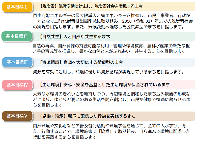 環境分野別の柱(脱炭素、自然共生、資源循環、生活環境)と分野横断の柱(協働・継承)を合わせた5つです。