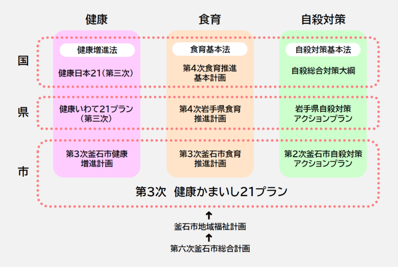 釜石市では、これまで「第2次健康かまいし21プラン(健康増進計画)」「第2次釜石市食育推進計画」「釜石市自殺対策アクションプラン」の三つの計画に基づき、市民のこころと身体の健康づくりに関わる様々な施策を推進してきました 。