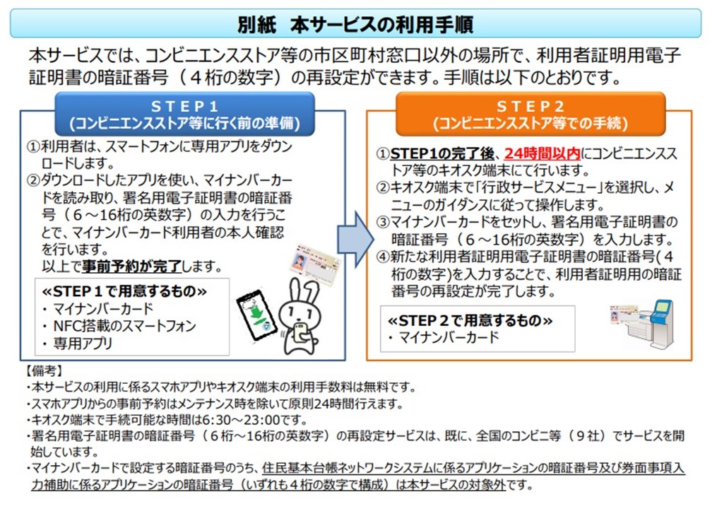 署名用電子証明書の暗証番号(6桁から16桁の英数字)の初期化(ロック解除)・再設定を全国のコンビニエンスストア等で行うことができます。
