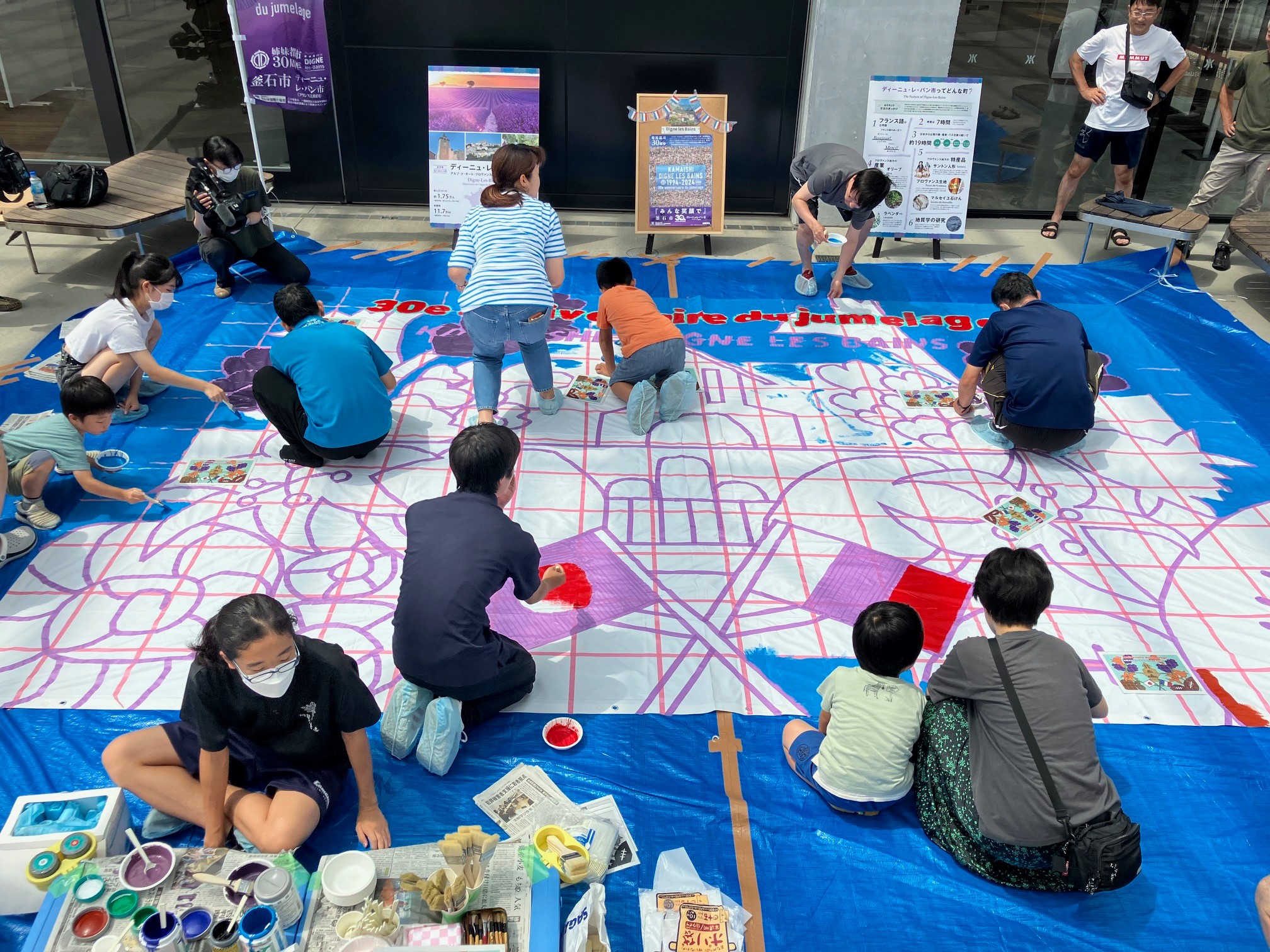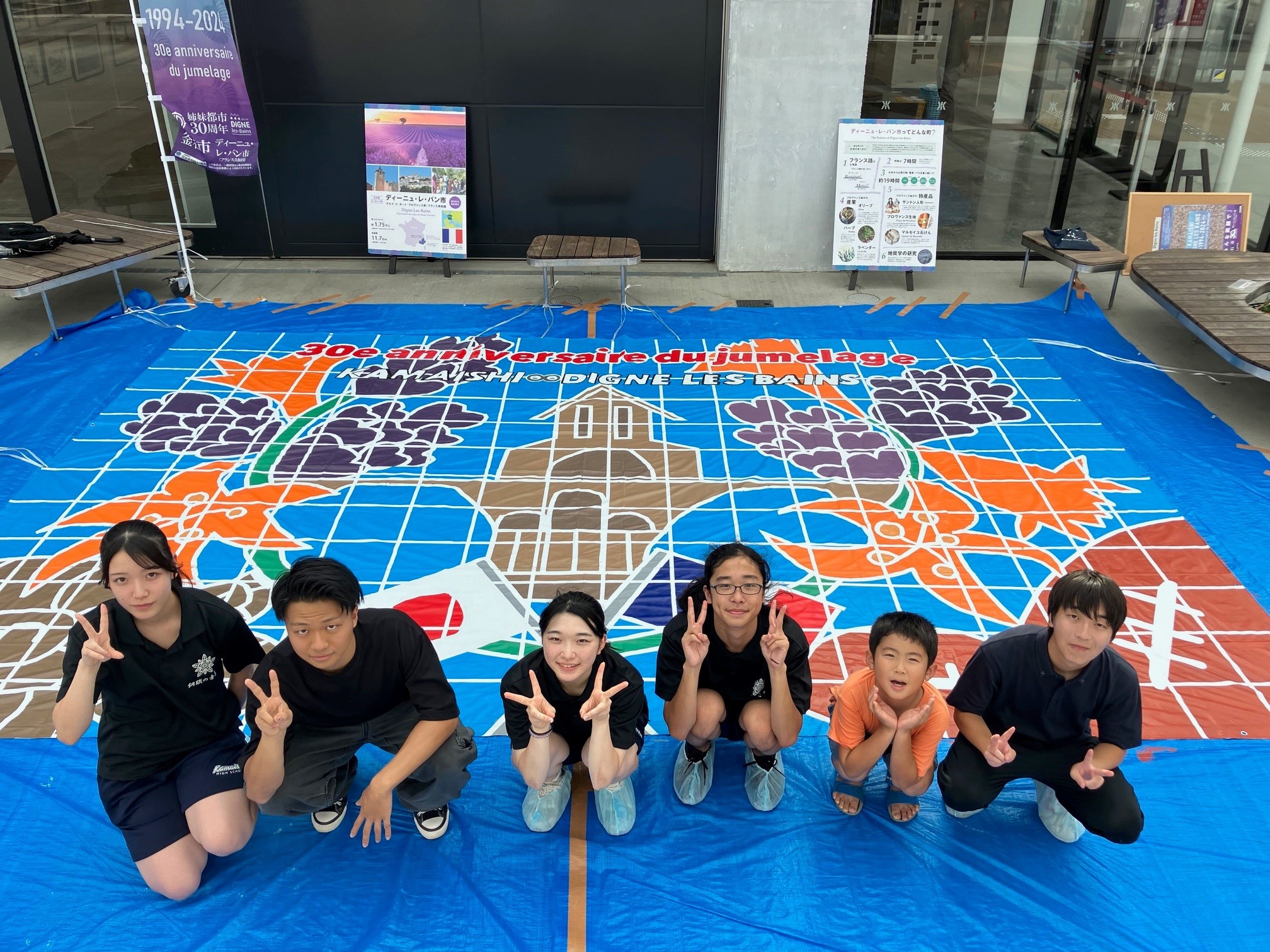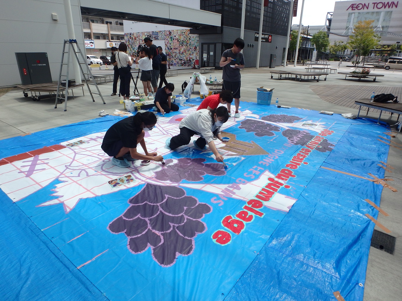 令和6年8月10日(木)に釜石市民補ホールTETTOホール前広場にて、 釜石公民館と共同で「歓迎巨大アート制作」を実施しました。この巨大アートは、釜石市とディーニュ・レ・バン市の姉妹都市提携30周年を記念して、釜石高校生有志の協力のもと、9月下旬に釜石を訪問するディーニュ・レ・バン市の代表団への歓迎の意を込めて制作されました。