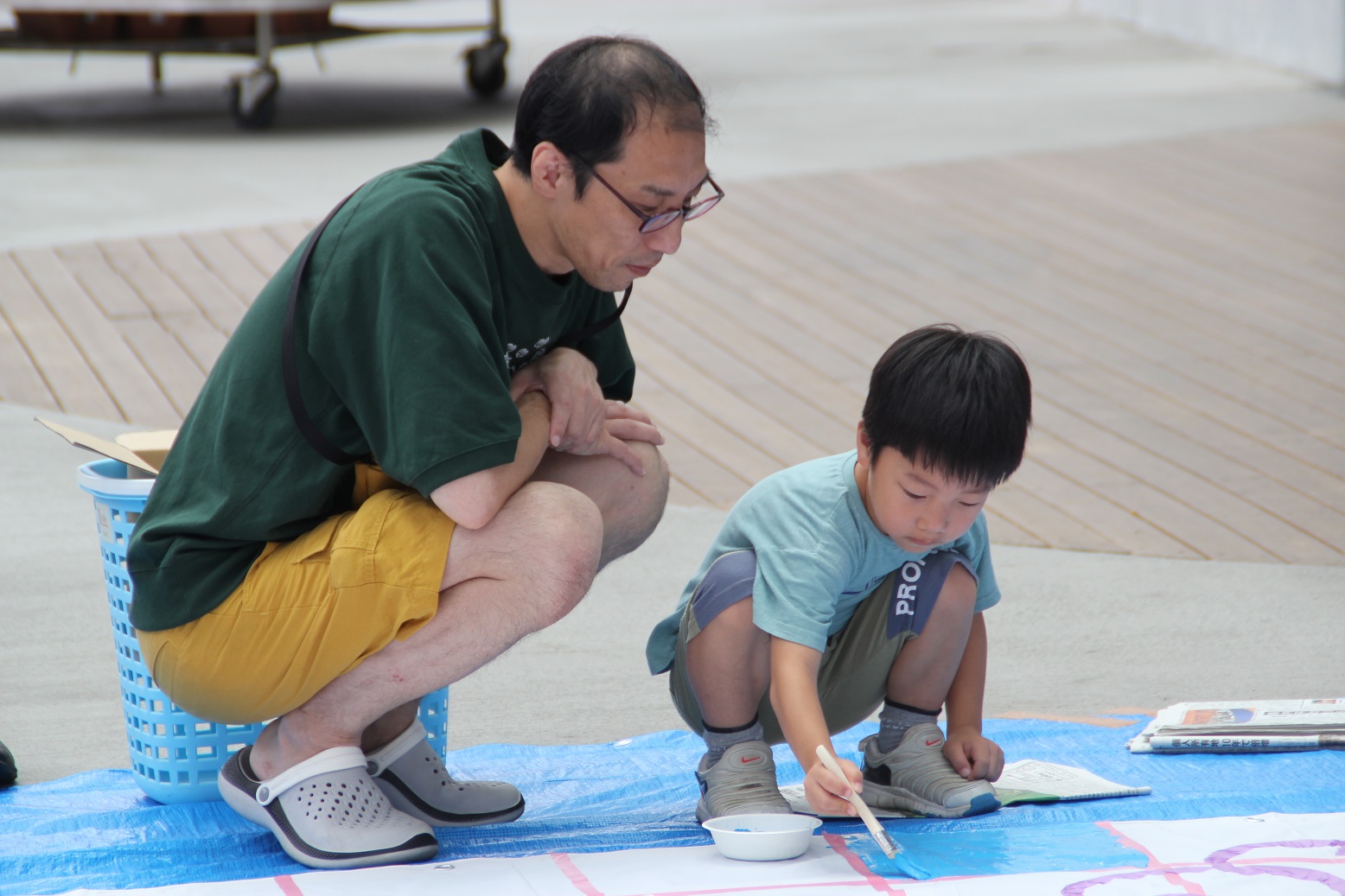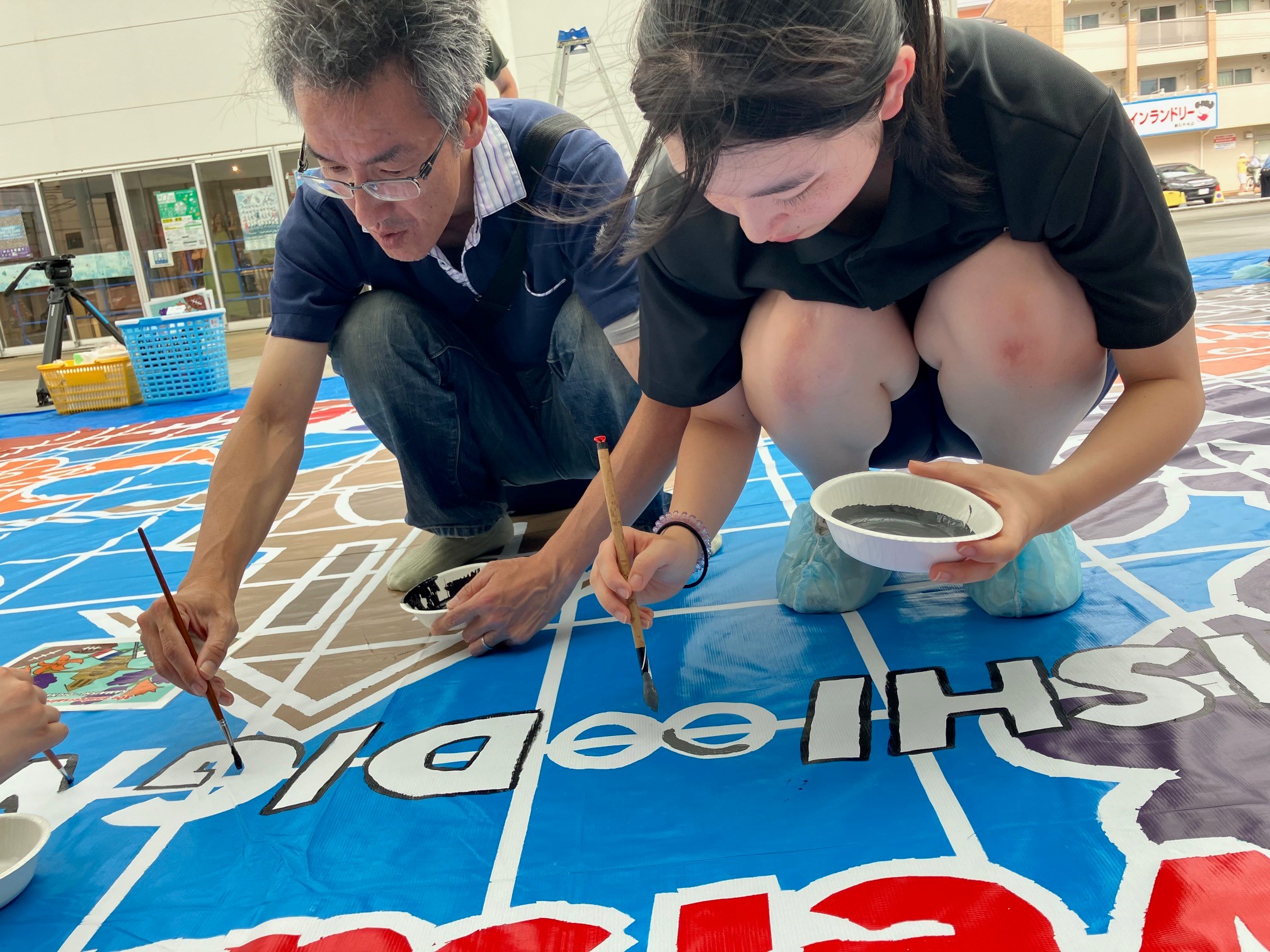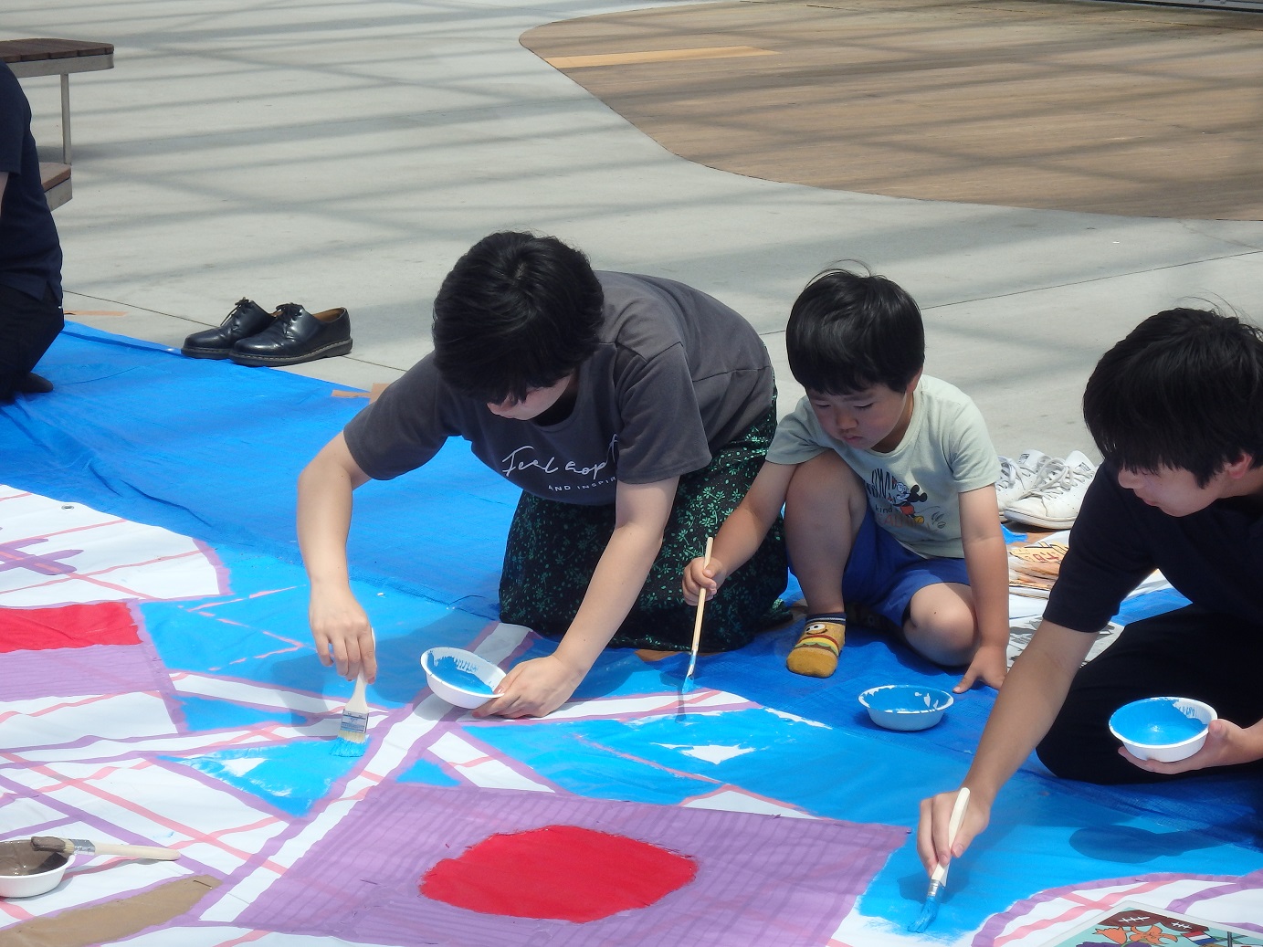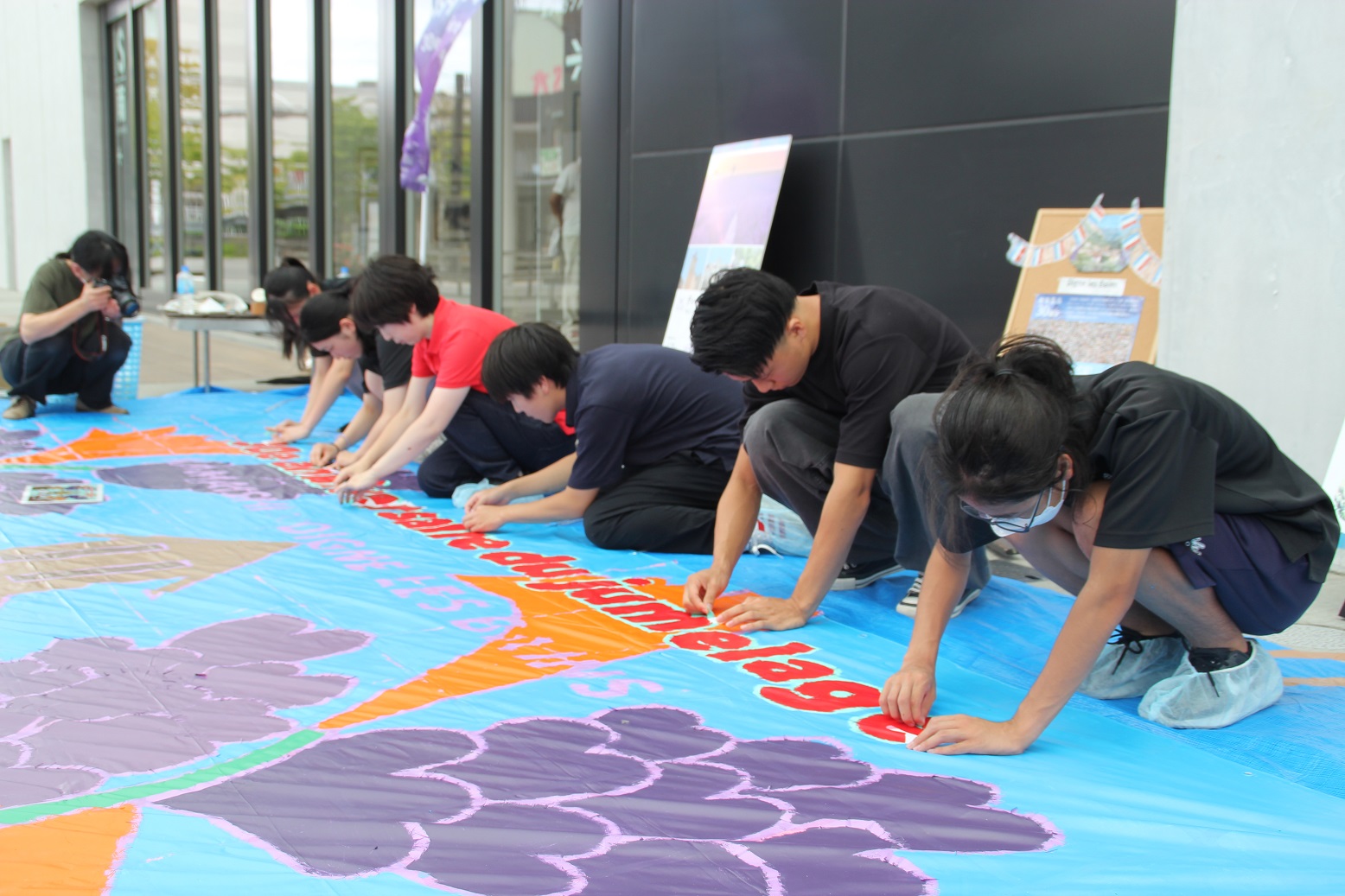 令和6年8月10日(木)に釜石市民補ホールTETTOホール前広場にて、 釜石公民館と共同で「歓迎巨大アート制作」を実施しました。この巨大アートは、釜石市とディーニュ・レ・バン市の姉妹都市提携30周年を記念して、釜石高校生有志の協力のもと、9月下旬に釜石を訪問するディーニュ・レ・バン市の代表団への歓迎の意を込めて制作されました。