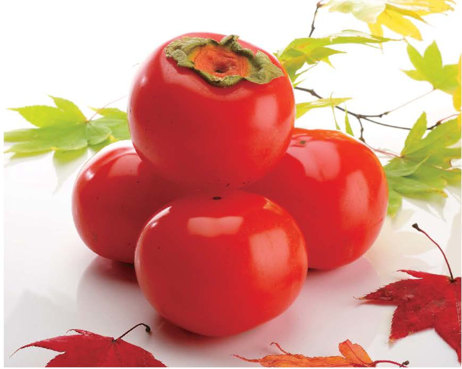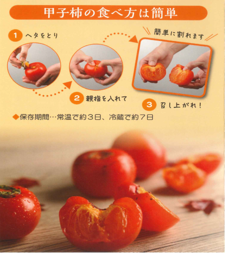 甲子柿の鮮紅色、ぷるんとした食感、燻した風味と甘さが特徴です。