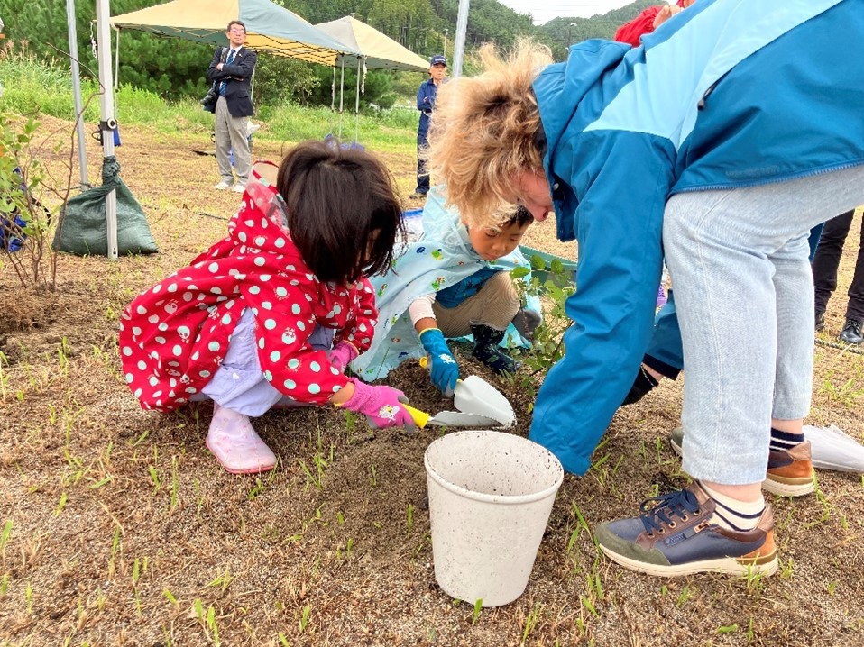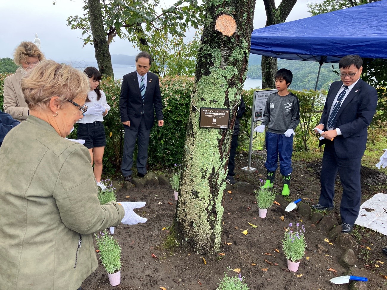 1994年の姉妹都市提携の際に、当時の両市代表団が植樹を行った「ディーニュ・レ・バン市の丘」(鉄の歴史館駐車場)にて記念植樹を行いました。両市の友好の証として、「友情」「信頼」の花言葉を持つ「こぶし」の苗木の植樹や、市内小学生と協力してディーニュ・レ・バン市で栽培が盛んなラベンダーの苗の定植を行いました。