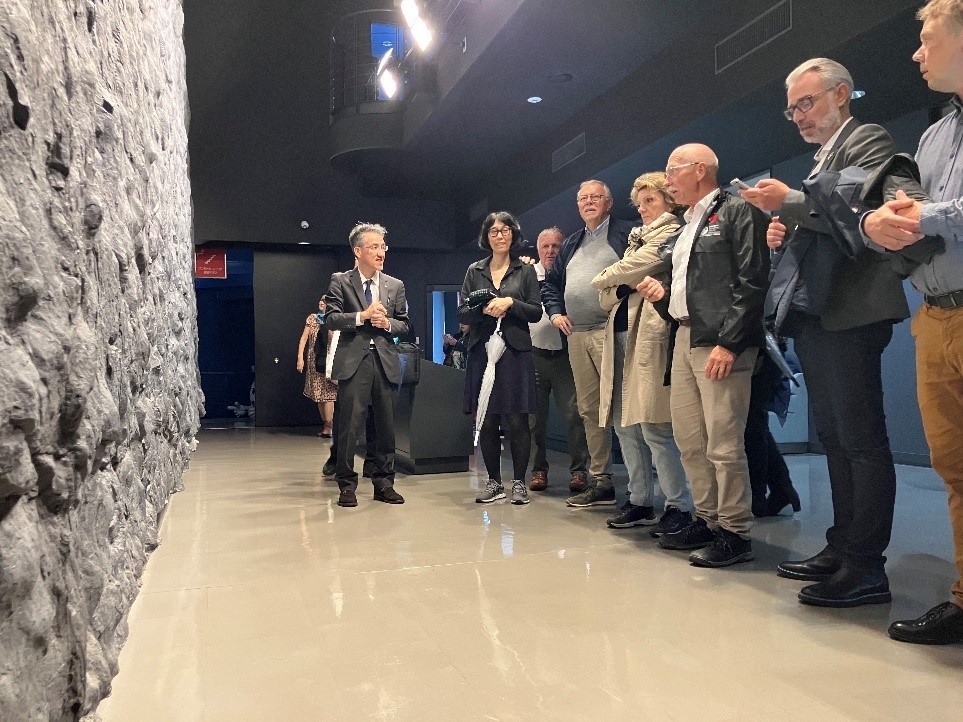 鉄の歴史館にて、釜石市とディーニュ・レ・バン市の姉妹都市提携のきっかけとなった「アンモナイトの壁」の原寸大剥離標本の複製(レプリカ)等の視察を行いました。また、代表団の中には、1992年の三陸・海の博覧会開催の際にこの壁のレプリカの制作に携わった技術者がおり、当時の貴重なお話を伺うことができました。