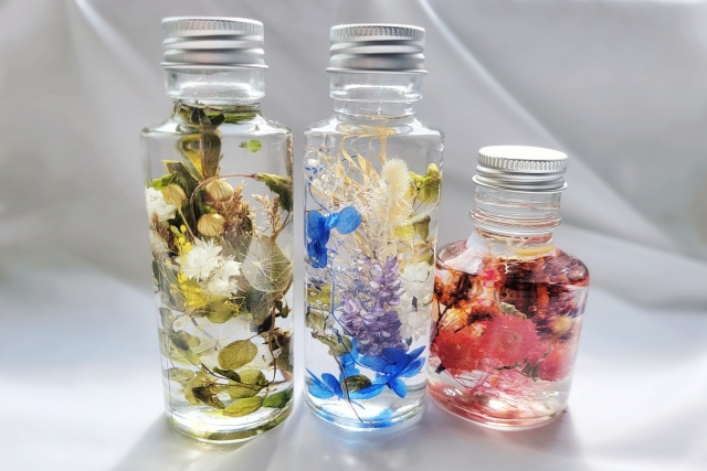 ハーバリウムとは、本来、「植物標本」を指す言葉でしたが、最近ではドライフラワーやプリザーブドフラワー、アーティフィシャルフラワーを瓶などに入れて、オイルに浸したものを「ハーバリウム」と呼んでいます。オイルに浸すことで美しい状態で長く鑑賞でき、インテリアとして好まれています。