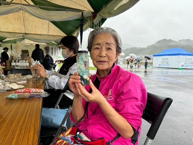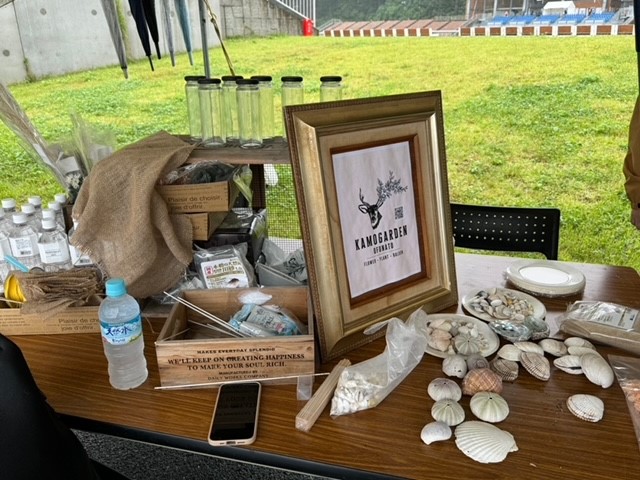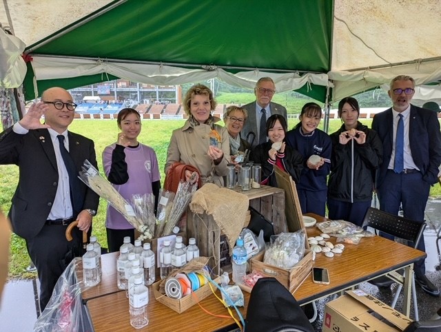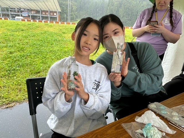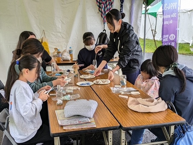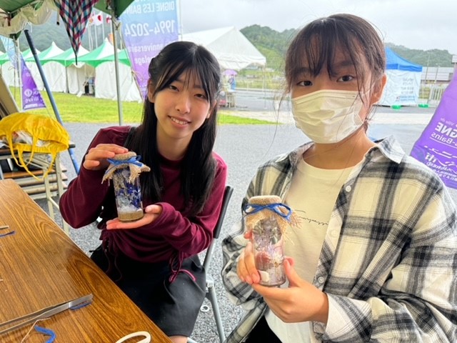 当日はあいにくの雨模様でしたが、多くの方に参加いただき和気あいあいとした雰囲気の中、個性豊かなハーバリウムを制作いただきました。また、ディーニュ・レ・バン市の代表団の皆様が当ブースを訪問し、材料について質問したり、ハーバリウムのプレゼントを受ける等、参加者の皆様やスタッフと交流を行いました。