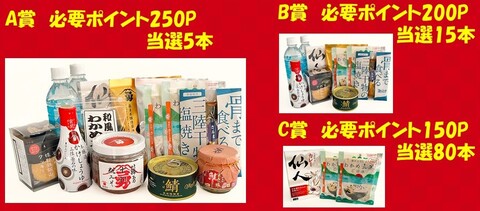 ※累計ポイント数により、複数応募も可。例:累計ポイント数が350であれば、B賞(200ポイント)に1口、C賞(150ポイント)に1口応募可。