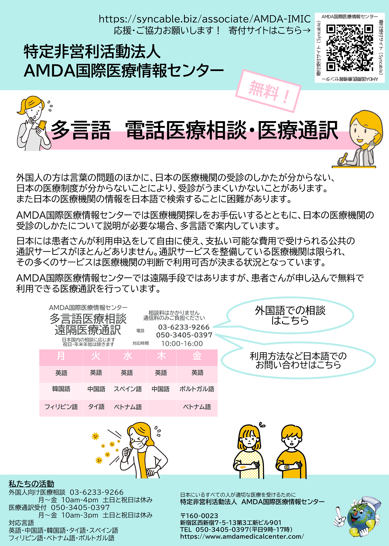 AMDA国際医療情報センターでは、外国人が病院に行ったとき、電話で通訳をしてくれます。無料です(電話代はかかります)。