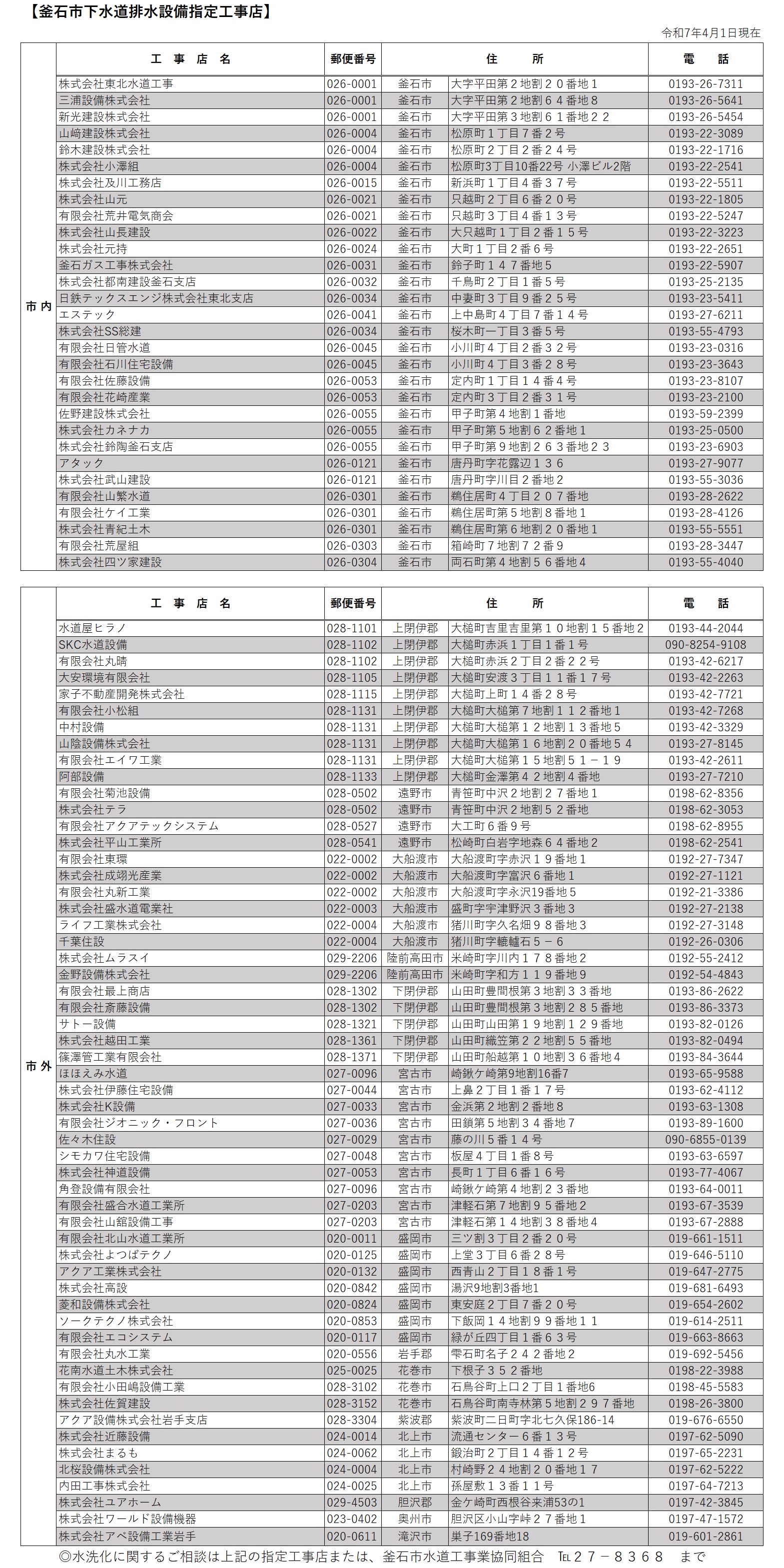 指定工事店は釜石市下水道条例及び釜石市排水設備工事設計基準等に基づき、皆様に代わって工事に必要な書類の作成から手続きまでを行いますので、お気軽にご相談くださいなお、指定工事店以外に依頼したり、無資格者が施工した場合には、釜石市下水道条例第29条により罰則の対象となる場合がありますのでご注意願います