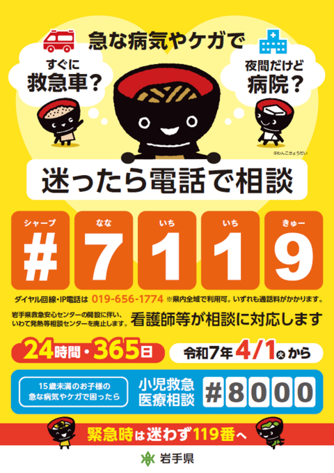 - #7119が利用できない場合、ダイヤル回線、IP電話からは、「019-656-1774」に電話してください。