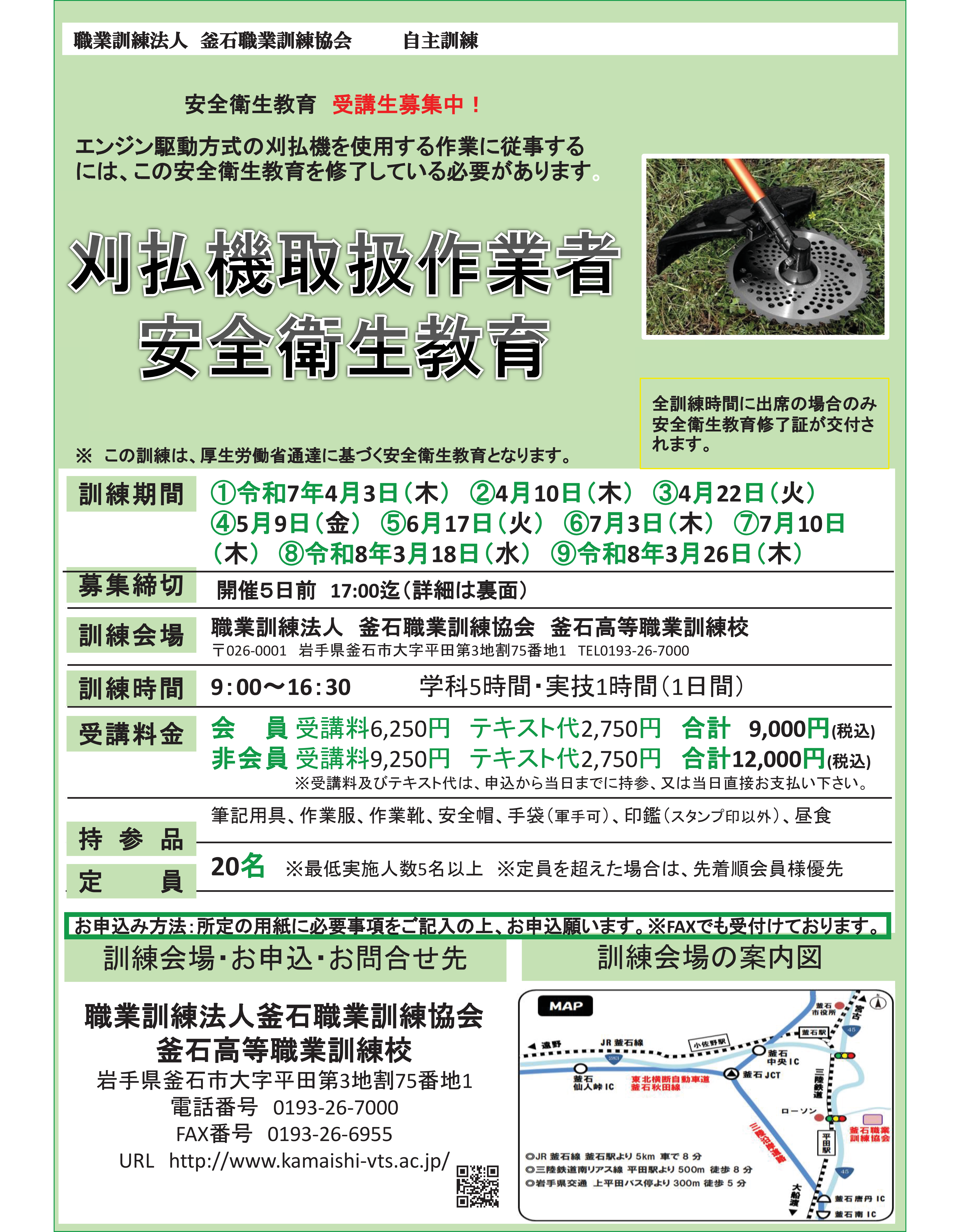 ◆刈払機取扱安全衛生教育 受講者募集 令和7年度◆ | 職業訓練法人釜石職業訓練協会公式ホームページ (kamaishi-vts.ac.jp) (外部リンク)