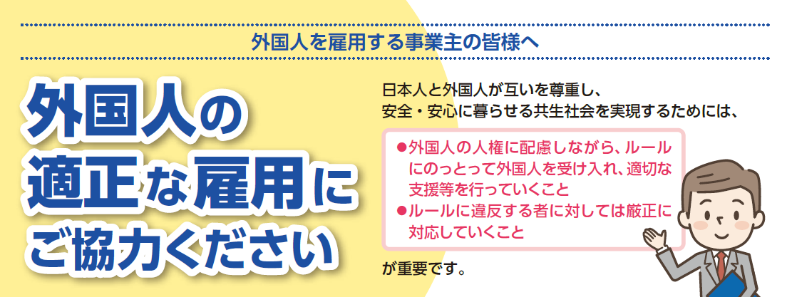 不法就労を防止し、外国人を適正に雇用するためには、在留カードの確認等、出入国管理関係法令等の関係法令を遵守することが必要です。