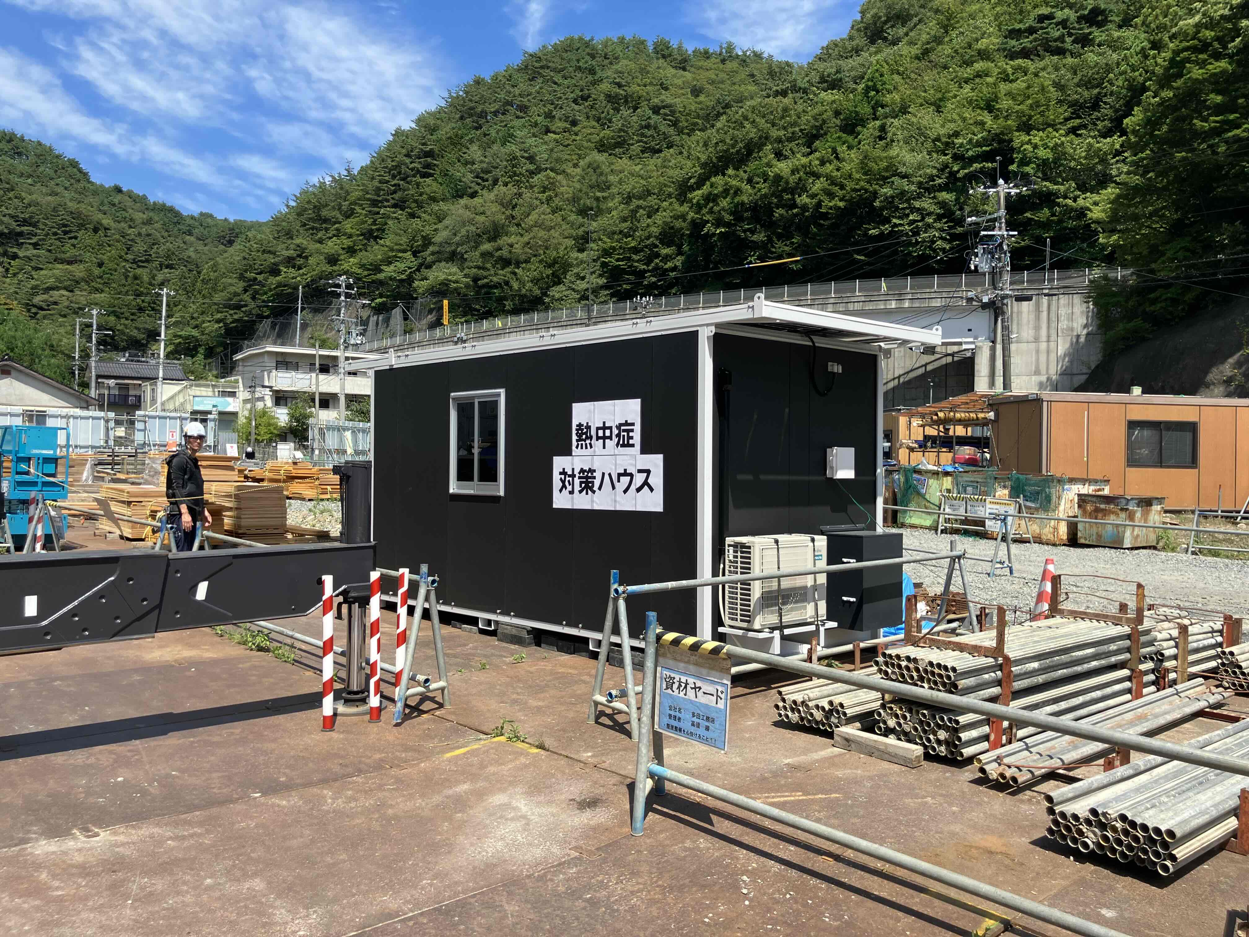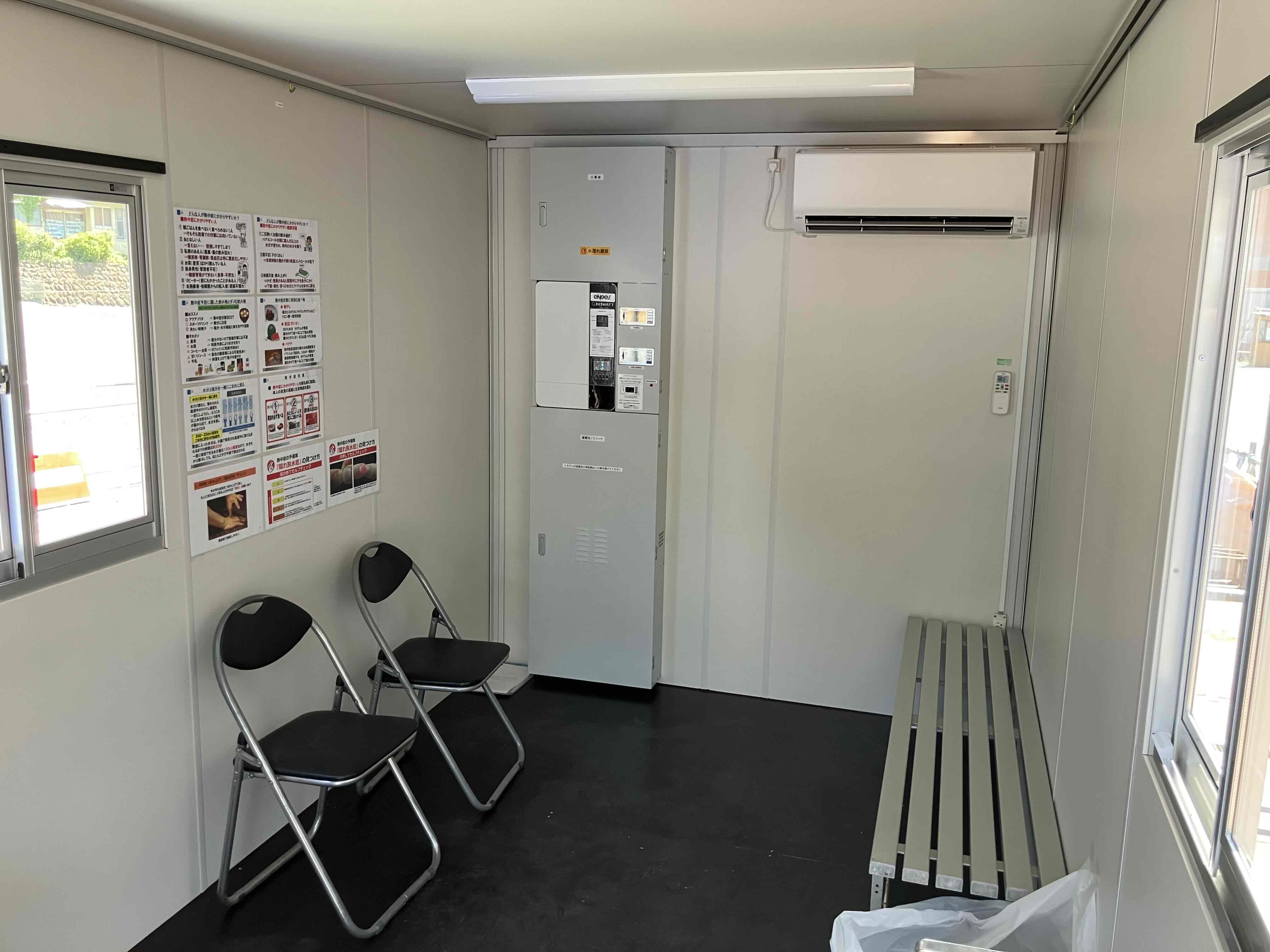 現場内に熱中症対策のため、ソーラーパネルを備え太陽光のみで照明やエアコンが稼働するプレハブの休憩所が設置されました。